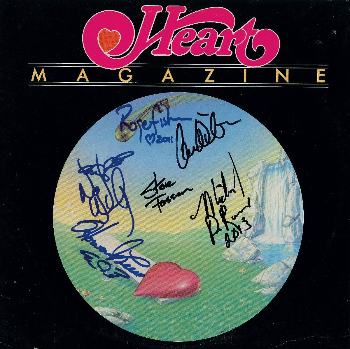 Magazine album signed in black felt tip, “Steve Fossen,” “Michael DeRosier, 2013,” and “Ann Wilson,” and in blue felt tip, “Roger Fisher, 2011,” “Nancy Wilson,” and “Howard Leese,” with the latter two adding hearts with wings. In fine condition. The record is included.