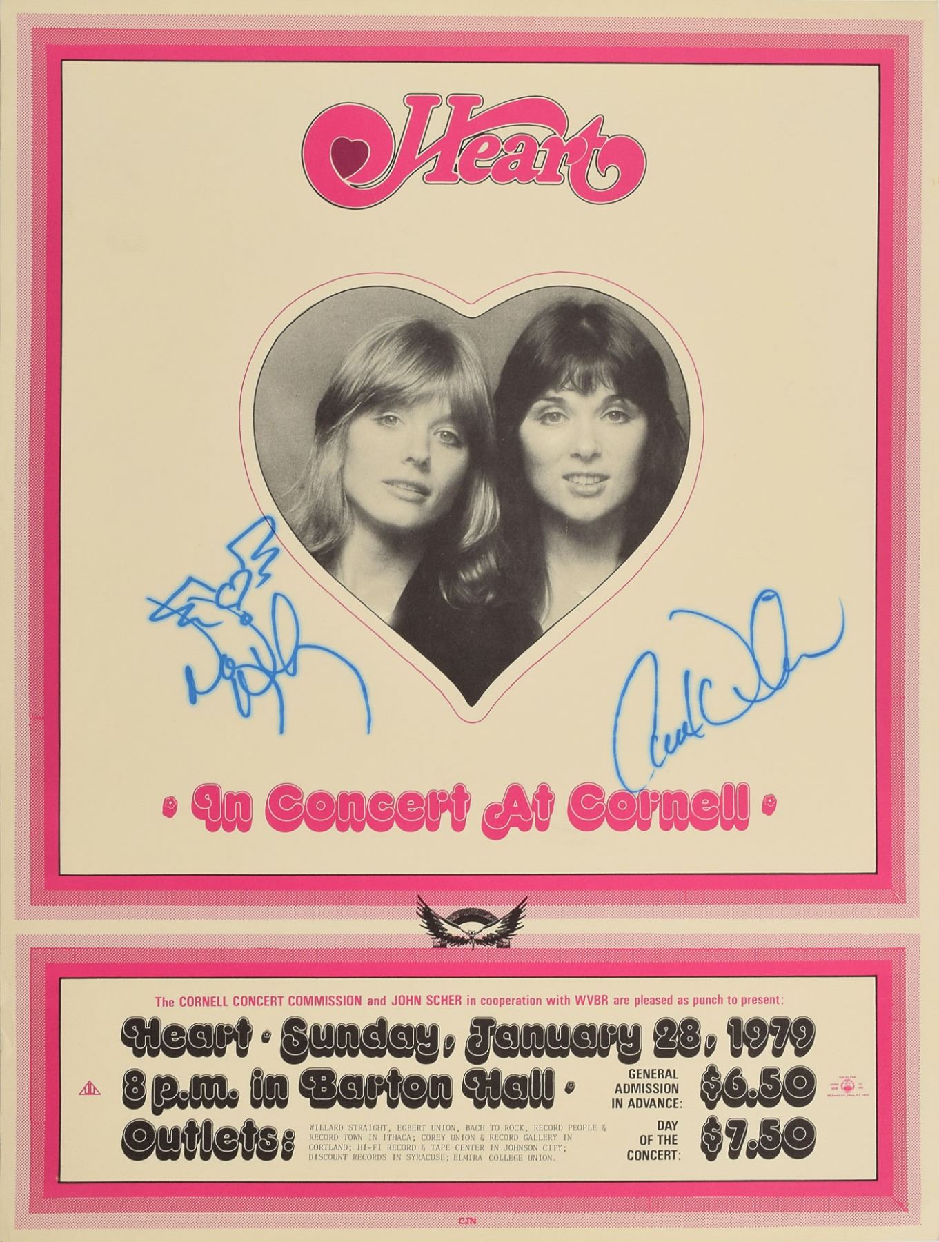 Original color 16 x 21.25 first printing poster for Heart at Barton Hall on January 28, 1979, signed in blue felt tip by Ann Wilson and Nancy Wilson. In fine condition, with haloing to the signatures.