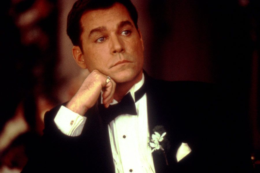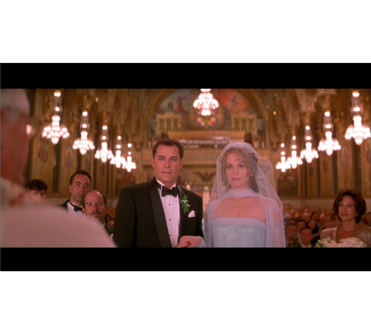 Hero tuxedo outfit worn by Ray Liotta as Dean Cumanno in Heartbreakers. Used in beginning scenes at church and banquet hall reception when Dean and Angela get married. Costume consists of black Giorgio Armani single breasted tuxedo jacket and matching pants, white cotton Brooks Bros. tux shirt, black satin cummerbund, black silk bow tie, white silk pocket square and Allen Edmonds black suede tux shoes size 9 1/2D. Accessories include small gold coin cufflinks, four gold black studs, red and white pass key for hotel door at The Regal Lily Inn. Change #1, Scenes 4-11.