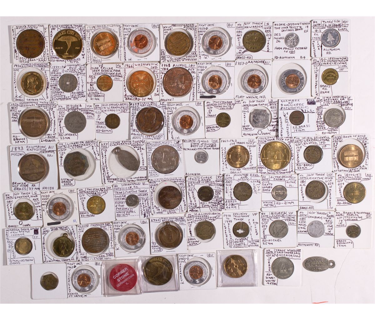 Lot of 64 tokens and medals from Iowa(13), Indiana (20) and Illinois (31). Including 10 encased cents, and 1893 Columbian Exposition medals. Worthy of a lot inspection. -60883