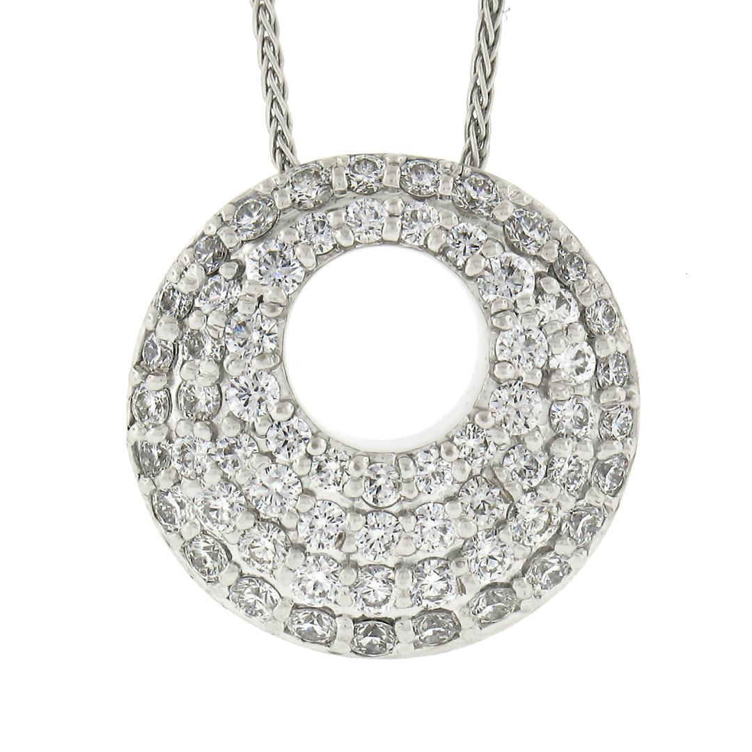 A solid 18k white gold circle pendant necklace by Hearts On Fire, with numerous of round cut natural diamonds (G-I - VS1-SI1 ; 1.05ctw). 20 inch wheat link chain, 7.12 grams total weight, pendant measures 16.3mm.