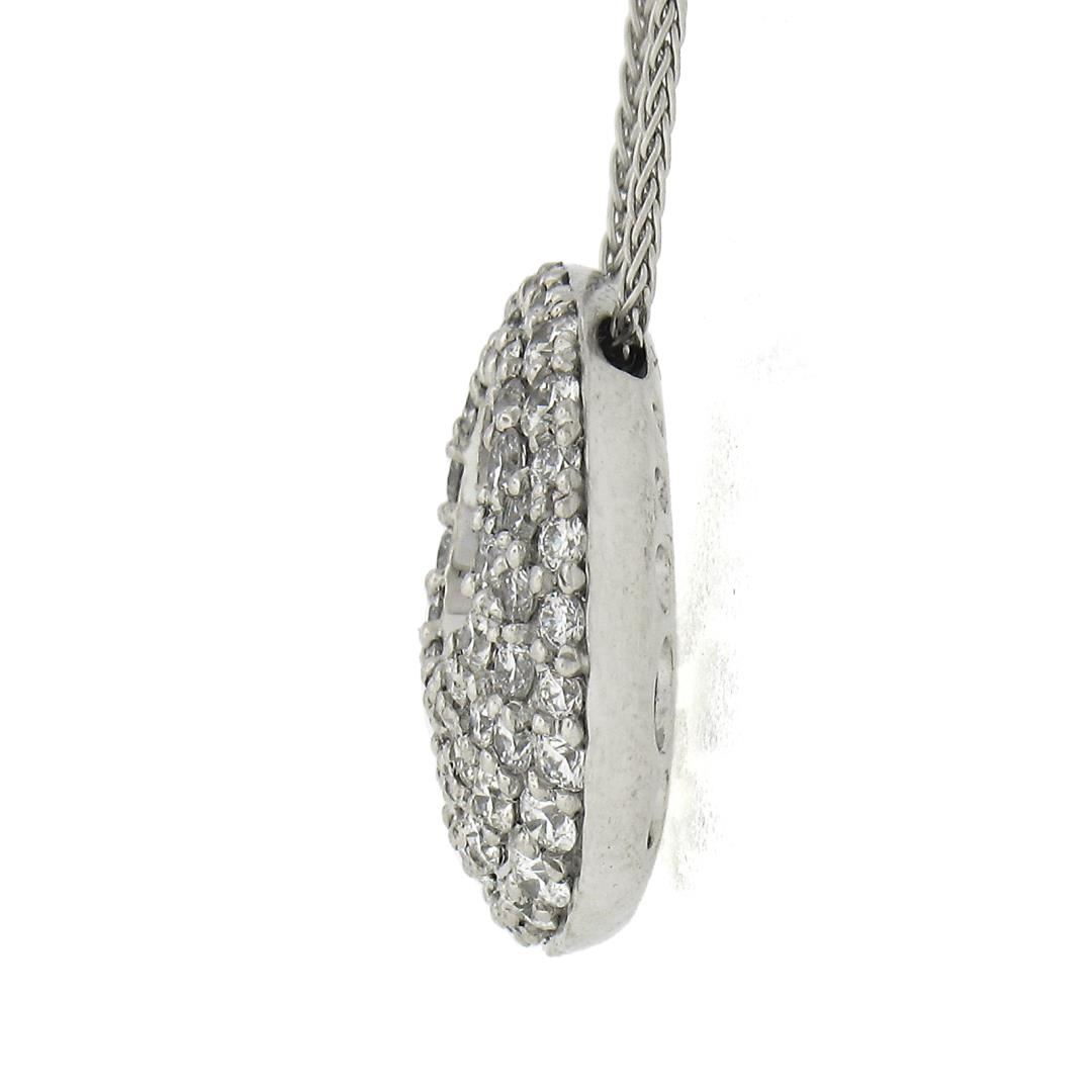 A solid 18k white gold circle pendant necklace by Hearts On Fire, with numerous of round cut natural diamonds (G-I - VS1-SI1 ; 1.05ctw). 20 inch wheat link chain, 7.12 grams total weight, pendant measures 16.3mm.