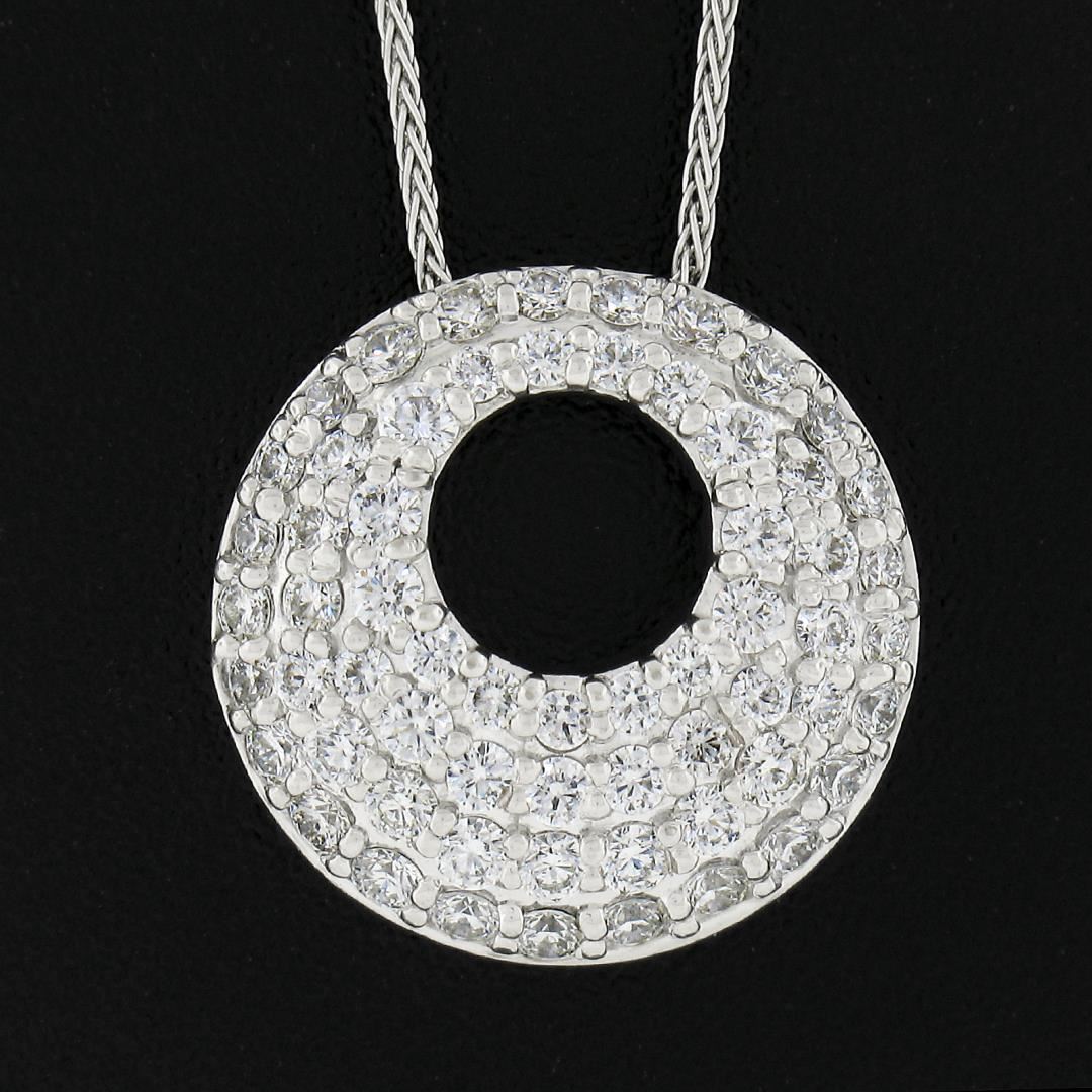A solid 18k white gold circle pendant necklace by Hearts On Fire, with numerous of round cut natural diamonds (G-I - VS1-SI1 ; 1.05ctw). 20 inch wheat link chain, 7.12 grams total weight, pendant measures 16.3mm.