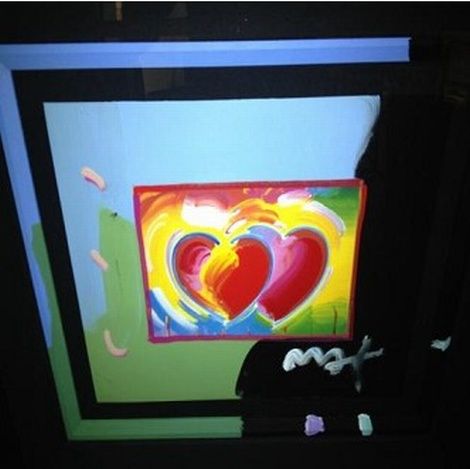"Hearts (Blue)" Peter Max Original Mixed Media - Professionally Framed & Matted - Hand Signed And Embellished By Peter Max - Authenticated With Max Gallery Copyright Stamp And Serial Number On The Back - Paper 13" X 17"