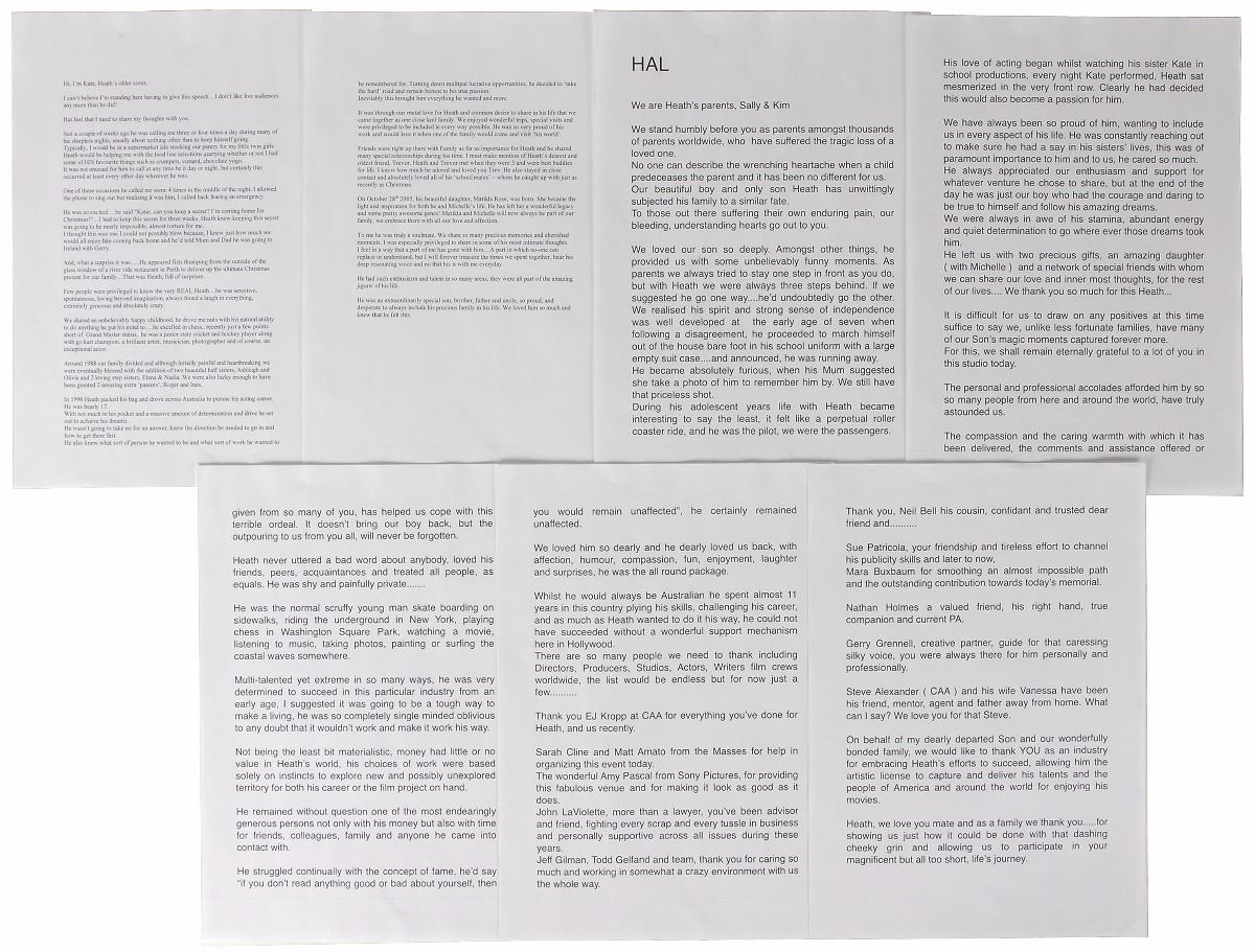 Original typescripts used at a memorial service in Hollywood for Ledger, totaling seven pages, 8.25 x 11.75, held on February 2, 2008. Includes a moving two-page tribute given by his older sister Kate, and a five-page eulogy given by his mother. In fine condition. Consignor notes that he acquired these from someone who worked closely with Heath.
