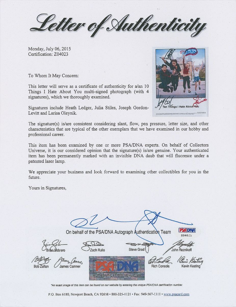 Scarce color glossy 8 x 10 Touchstone Pictures promotional photo for the 1999 film 10 Things I Hate About You, signed in various colored felt tip, “Joey G[ordon] L[evitt]” and “Heath [Ledger],” signing inside a hand-drawn flag, “Julia [Stiles],” adding designs around her name, and “Larisa [Oleynik],” adding a heart above. In fine condition. Accompanied by a full letter of authenticity from PSA/DNA. Highlighted by the presence of the ill-fated Ledger, this is an exceptional fully signed photo of the cast of this beloved late ’90s teen comedy.