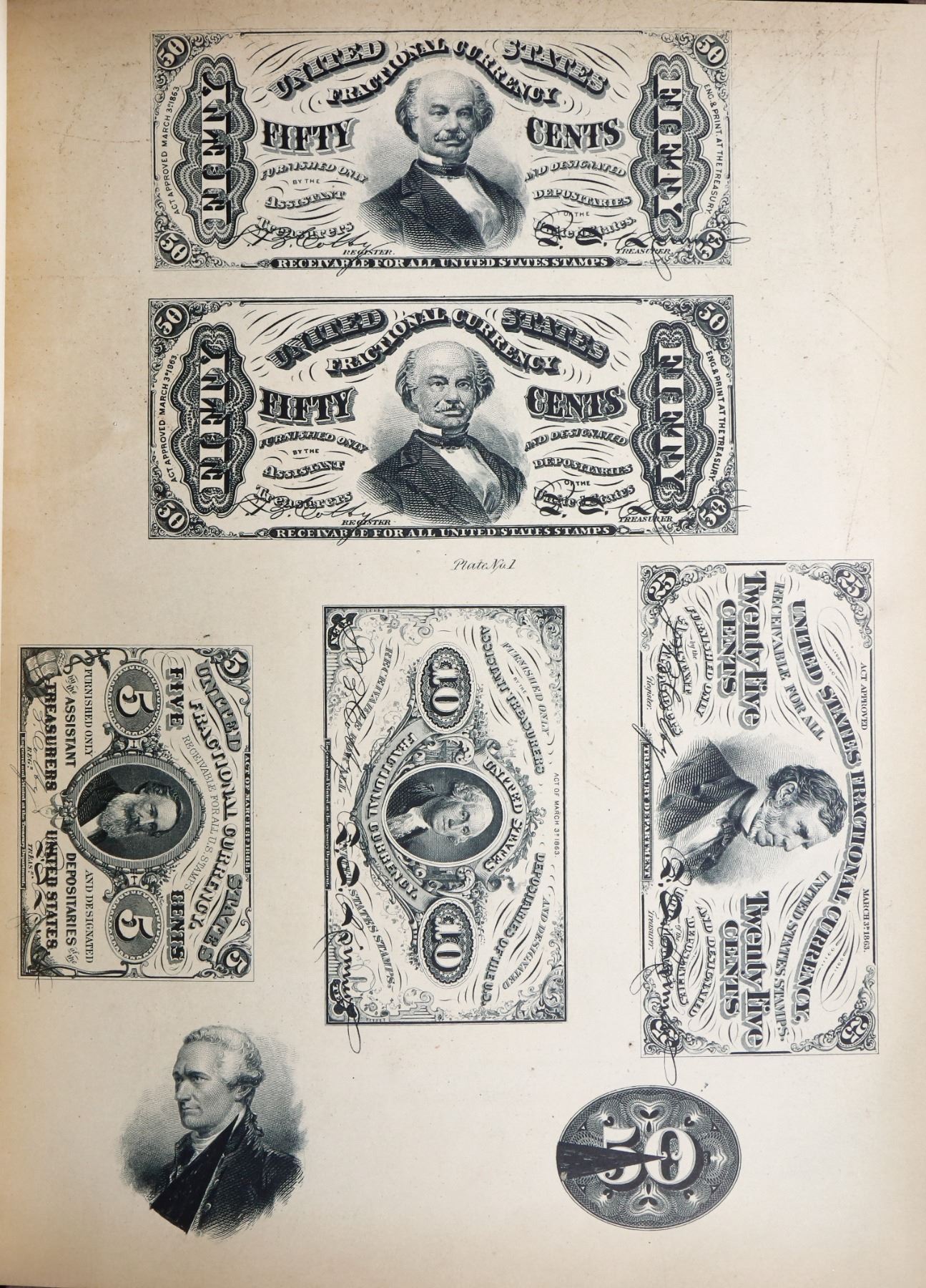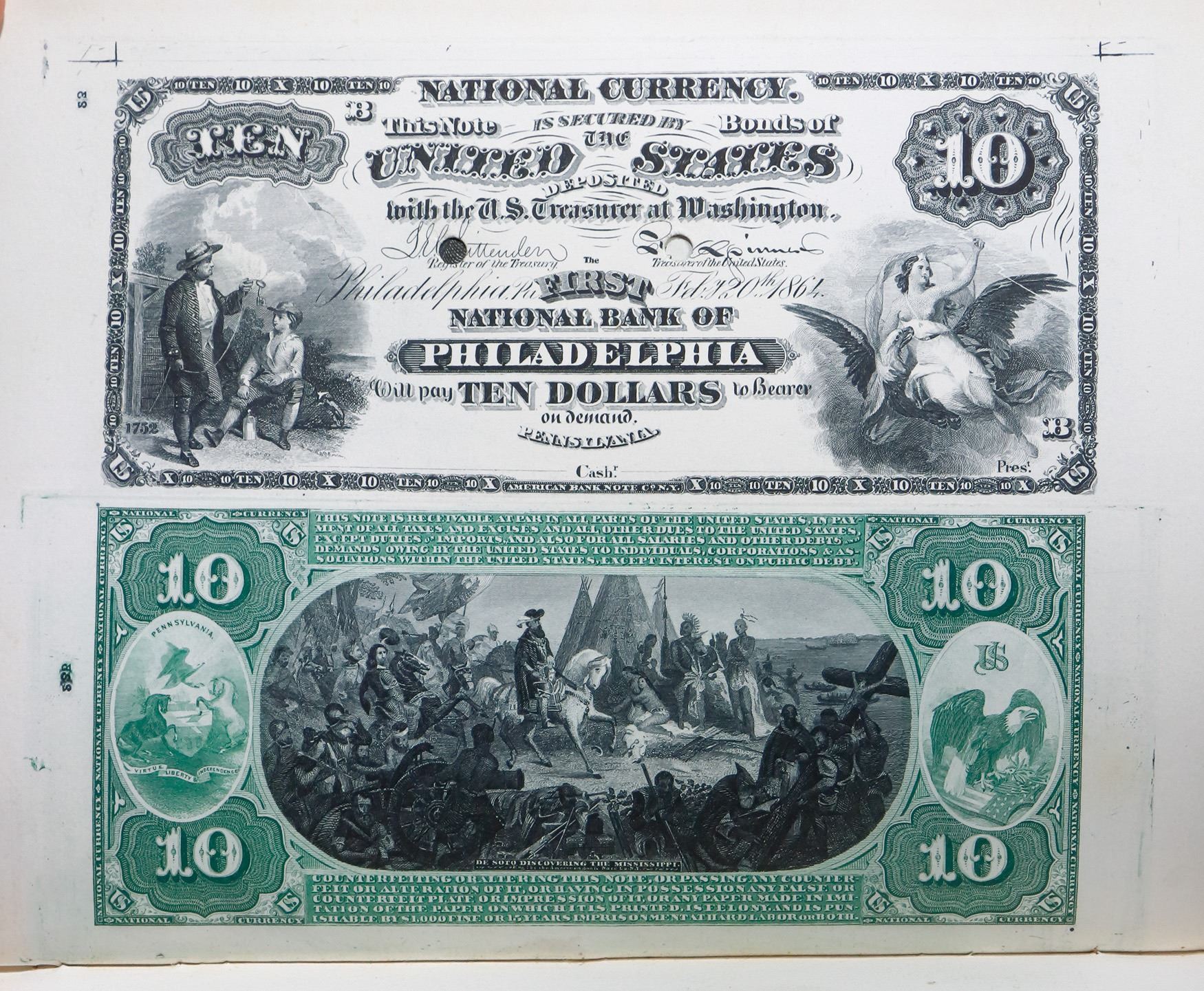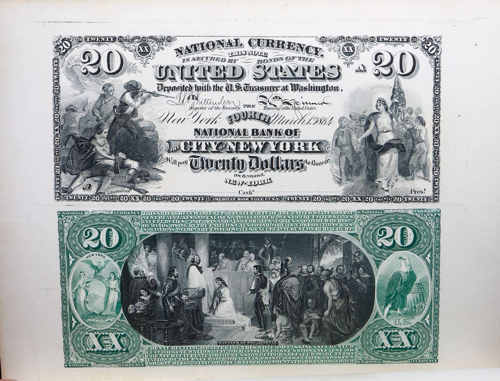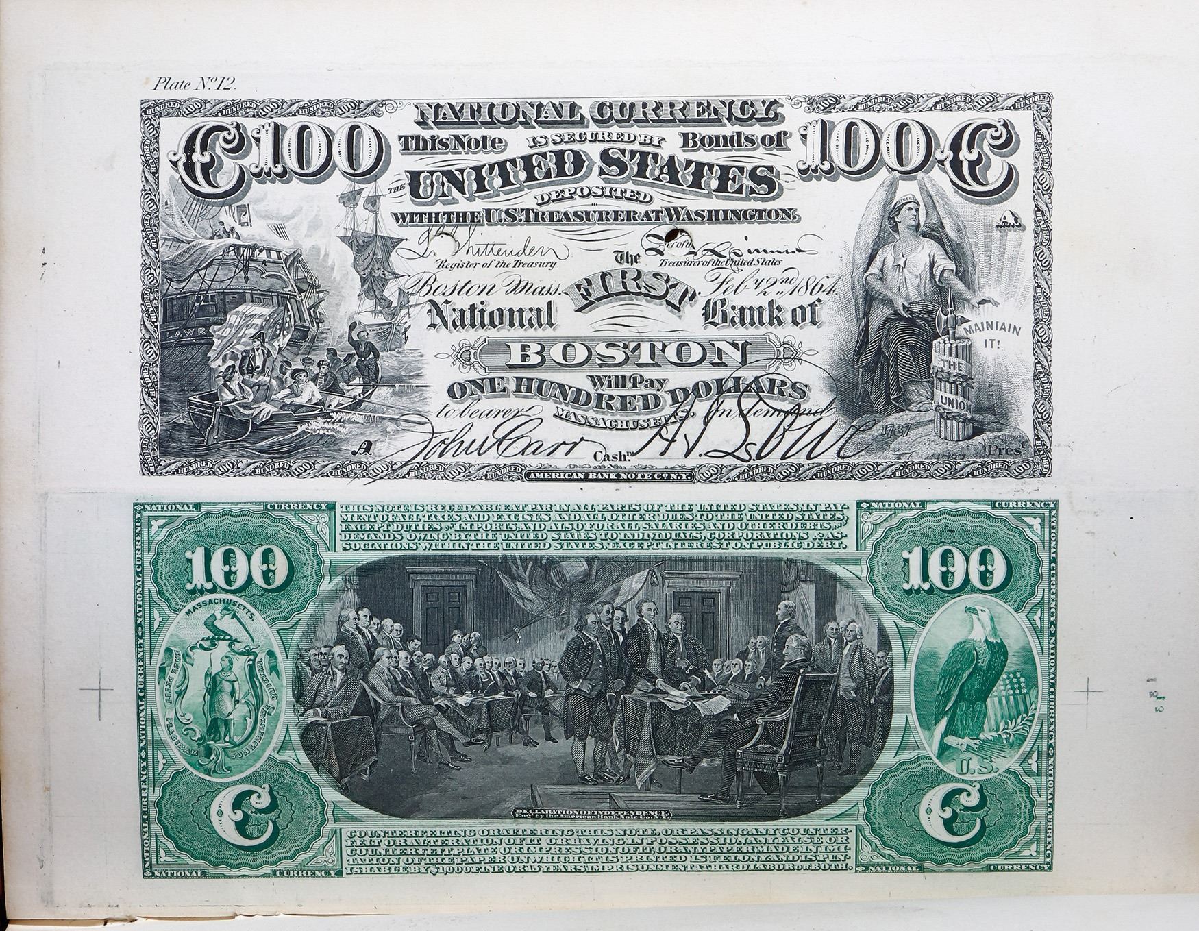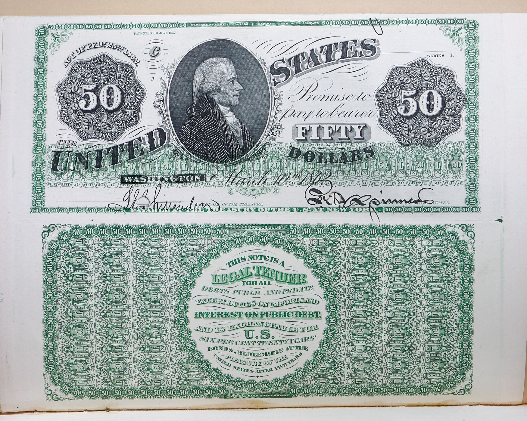 large format, July 7, 1867, in Very Fine condition; these counterfeit detector books are quite popular among collectors as the included proof impressions are quite desirable. This book has a strong emphasis on National Currency with full face and back impressions of the $100, $20 & $10 First Charter period designs. Also seen a face and back impression of 1862 $10 & $50 Legal Tender types. Several die proofs and other impressions are had as well. Overall nice quality of the cover and pages with only some wear at the top and bottom of the spine and light abrasions noticed. Shipping charges apply - weight 2 lbs.