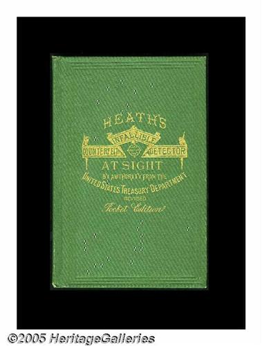 <B>Heath's Infallible Counterfeit Detector Pocket Edition.</B></I> This twelfth edition from 1877 is in beautiful condition. Its binding is tight, its pages clean, the gold foil is fresh and all of the plates are present.