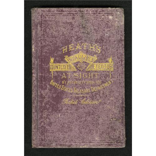 <B>Heath's Infallible Counterfeit Detector Pocket Edition Eleventh Edition 1873. </B></I><BR> This edition is complete with a tight spine while the cover shows aging. Included with this lot are three Fractional "notes" that have been cut out of another Heath - 5c Clark; 10c Washington; and a 25c Fessenden.<BR><BR><b>Shipping:</b> Coins & Currency (<a target="_blank" href="http://www.heritageauctions.com/common/shipping.php">view shipping information</a>)