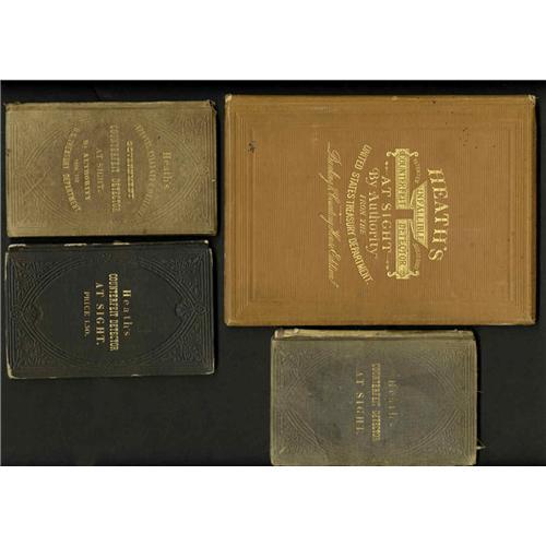 <B>Heath's Infallible Counterfeit Detector at Sight Three Examples</B></I><BR><B>Heath's Infallible Counterfeit Detector At Sight Banking and Counting House Edition.</B></I><BR>This lot has a first edition, first edition seven thousand, and a second edition of the former listing. All three of these detectors have seen better sleuthing days. Two have loose bindings and all three have various degrees of spine chipping. The Banking and Counting House Edition from 1873 has only four plates.