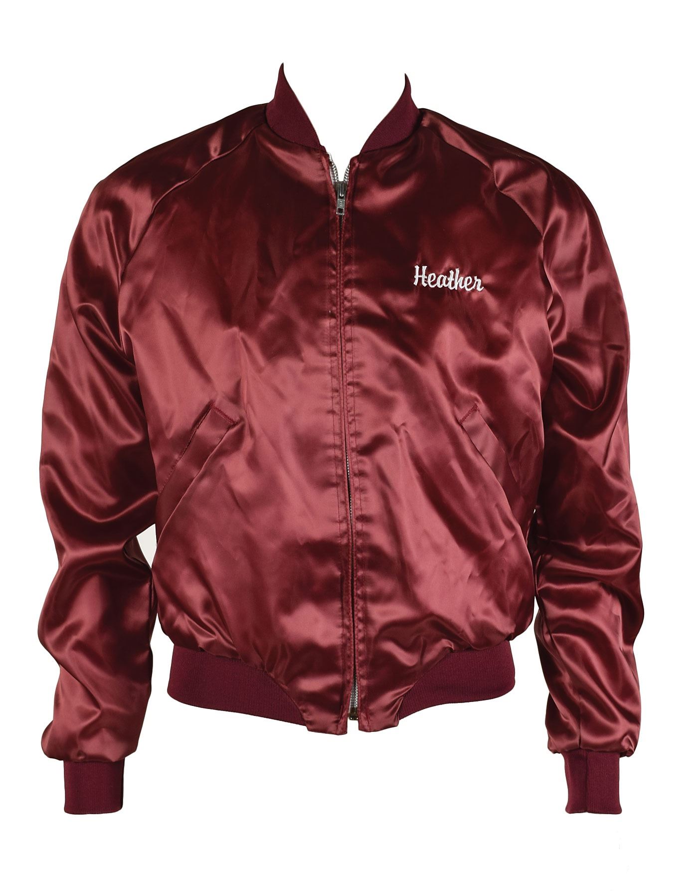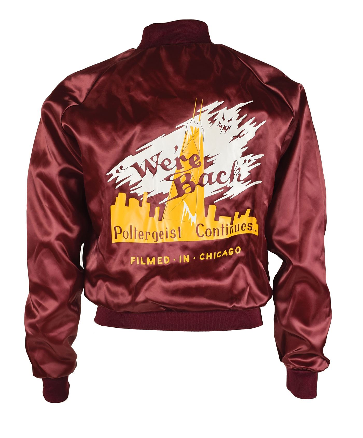 American actress (1975–1988), best remembered for her memorable performance in the horror classic Poltergeist—including the famous line 'They're here'—who tragically died at the age of 12. Heather O'Rourke's personally-owned and -worn maroon nylon cast jacket for the 1988 film Poltergeist III, size small, made by Aristo Jac by Hilton, with left chest area embroidered in white thread, "Heather," and the back featuring a large white-and-yellow design with skyscraper against a ghostly apparition, which reads: "'We're Back,' Poltergeist Continues…, Filmed in Chicago." In fine condition. Accompanied by a certificate of authenticity signed by her mother, Kathleen O'Rourke. Heather O'Rourke tragically died four months before the theatrical release of Poltergeist III, which was dedicated to her memory.