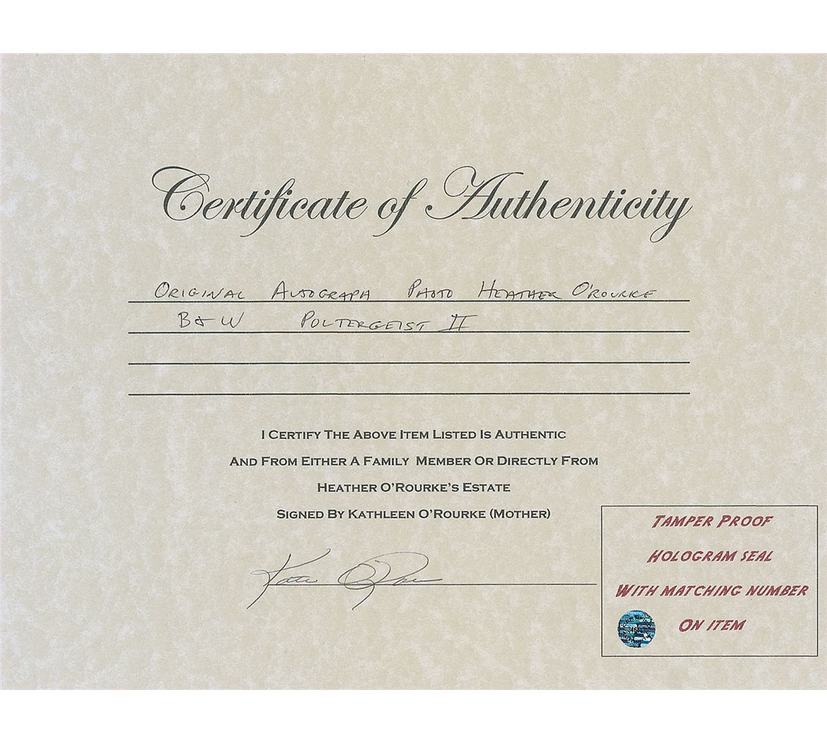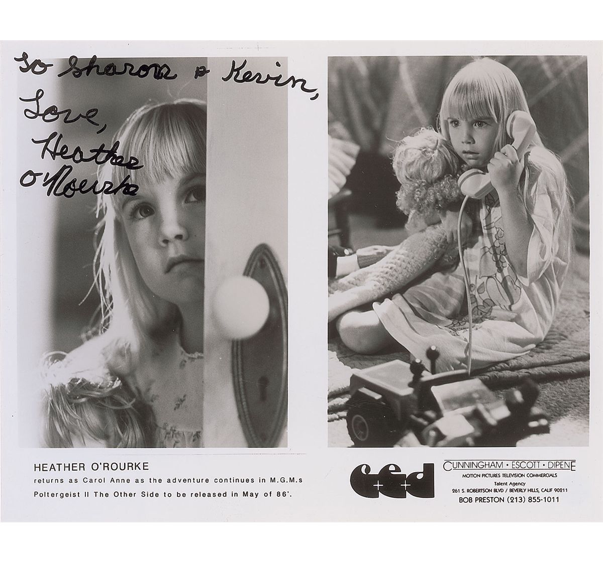 American actress (1975–1988), best remembered for her memorable performance in the horror classic Poltergeist, who tragically died at the age of 12. Glossy 10 x 8 photo, signed and inscribed in black felt tip “To Sharon & Kevin, Love, Heather O’Rourke.” In fine condition. Accompanied by a certificate of authenticity signed by her mother, Kathleen O’Rourke.