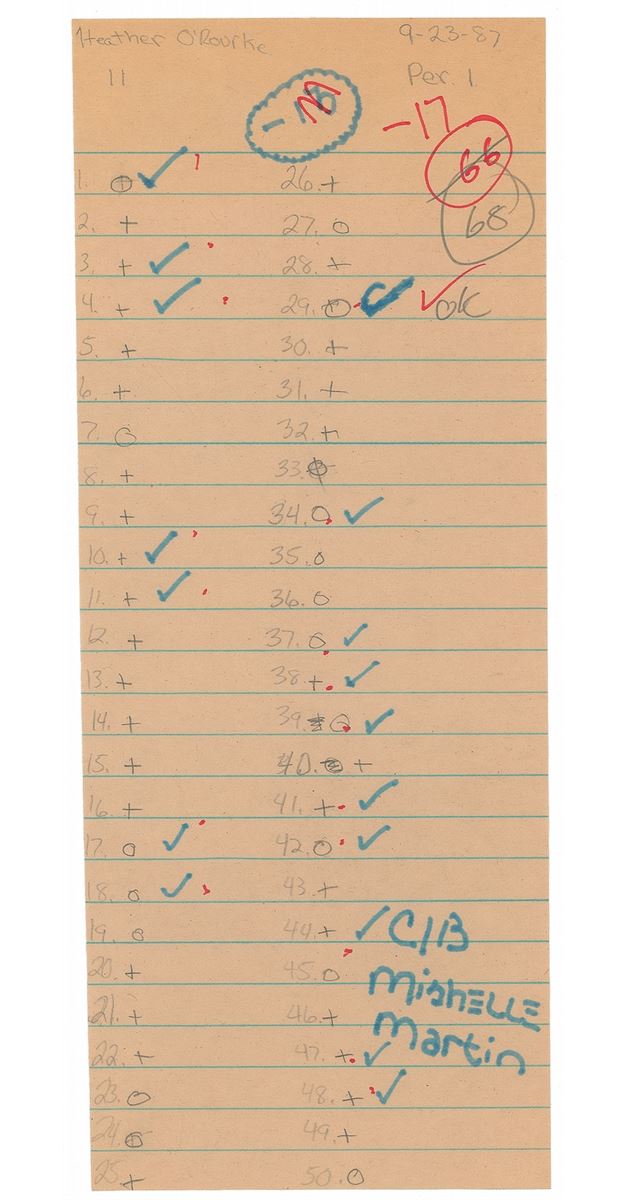 American actress (1975–1988), best remembered for her memorable performance in the horror classic Poltergeist, who tragically died at the age of 12. Handwritten quiz in pencil, one page, 4.25 x 10.5, signed at the top, “Heather O’Rourke, 9-23-87.” O’Rourke answers fifty questions with either a plus sign or a zero. In fine condition, with uniform toning. Accompanied by a certificate of authenticity from Tammy O’Rourke Walker.