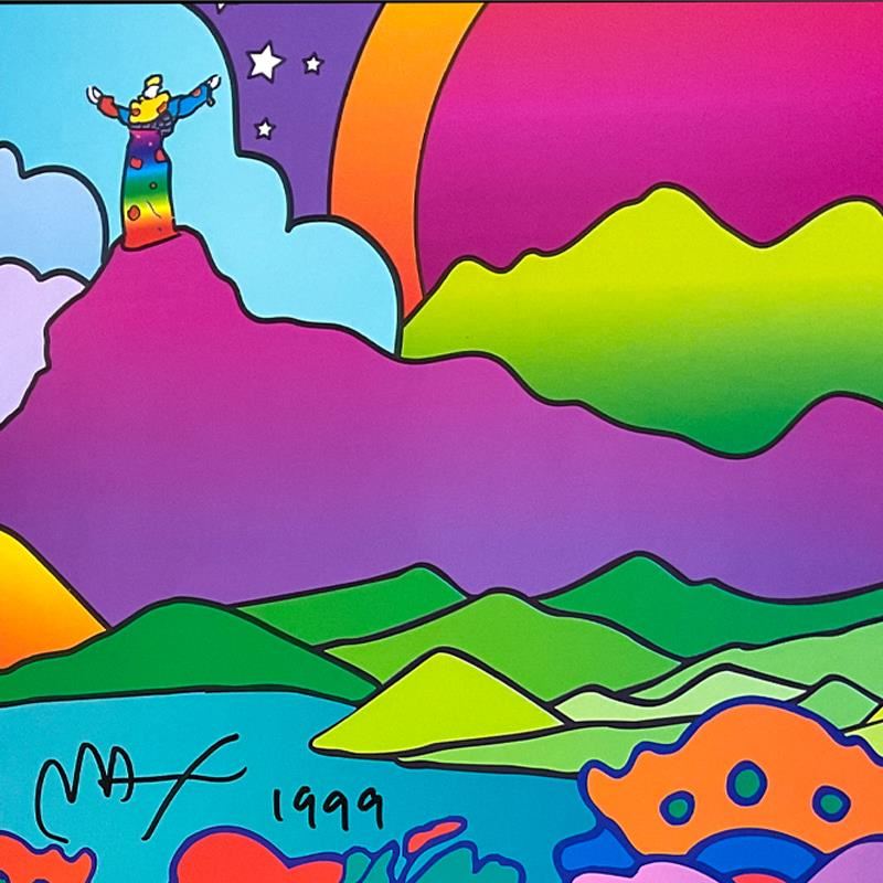 "Heaven on Earth" is an offset lithograph on paper by Peter Max, hand signed by the artist. This piece comes custom framed. Includes Letter of Authenticity. Measures approx. 24" x 21.5" (frame), 20" x 17.5" (image).