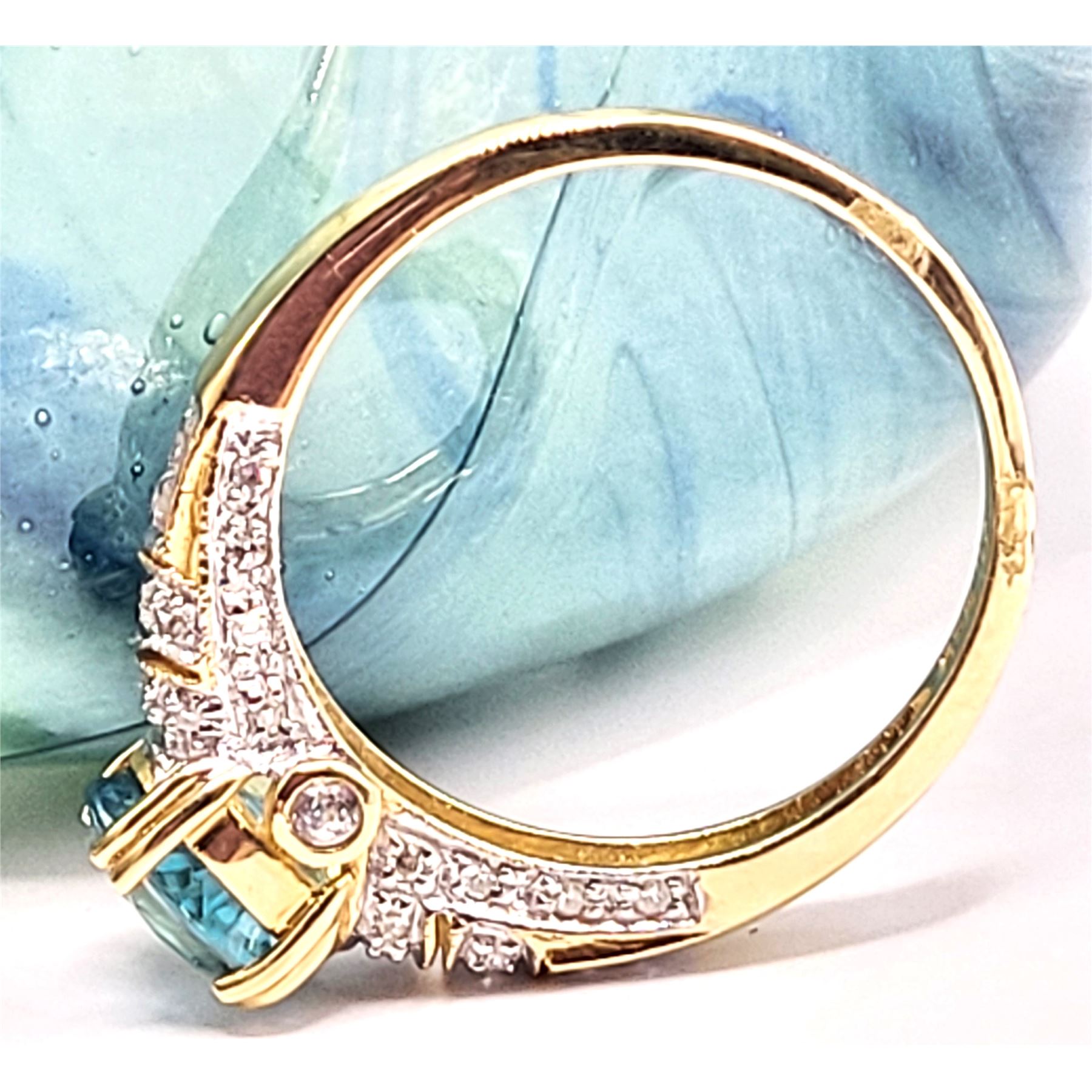This is a 14 karat yellow gold ring that features a gorgeous oval-cut, East-West set with double prongs, genuine blue zircon, approximately 2.00 carats. There are .25 carats total weight of round, brilliant-cut diamonds in the bridge and along the shoulders. This ring is an approximate US size 10 and can be sized for an additional charge. Please contact Bidfair Fine Jewelry for sizing details.This is a brand new item that has been held in back stock. It is in excellent condition, but may have minor signs of storage, such as fine scratches or patina. Admin: 33110/10lh