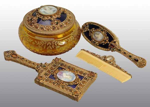 Description Includes one mirror, one brush, one comb, and one bowl. The mirror has over 100 jewels and 80 pearls depicting a beautiful lady. The brush has over 30 jewels and 29 pearls with one pearl missing. The comb has 14 jewels with one small jewel missing depicting a beautiful lady. The bowl is magnificently cut, etched, and covered in 54 jewels and 62 pearls depicting a lady. Quite a rare set. Condition (Excellent). Size Mirror: 11 - 1/2" L.