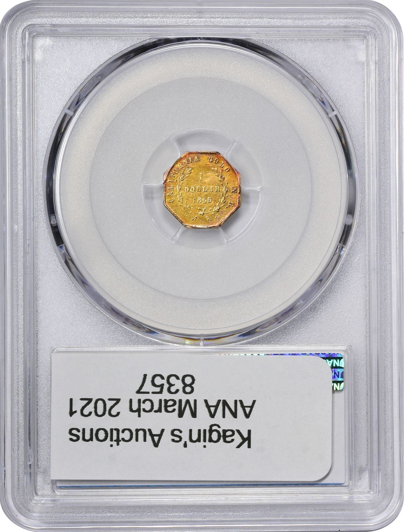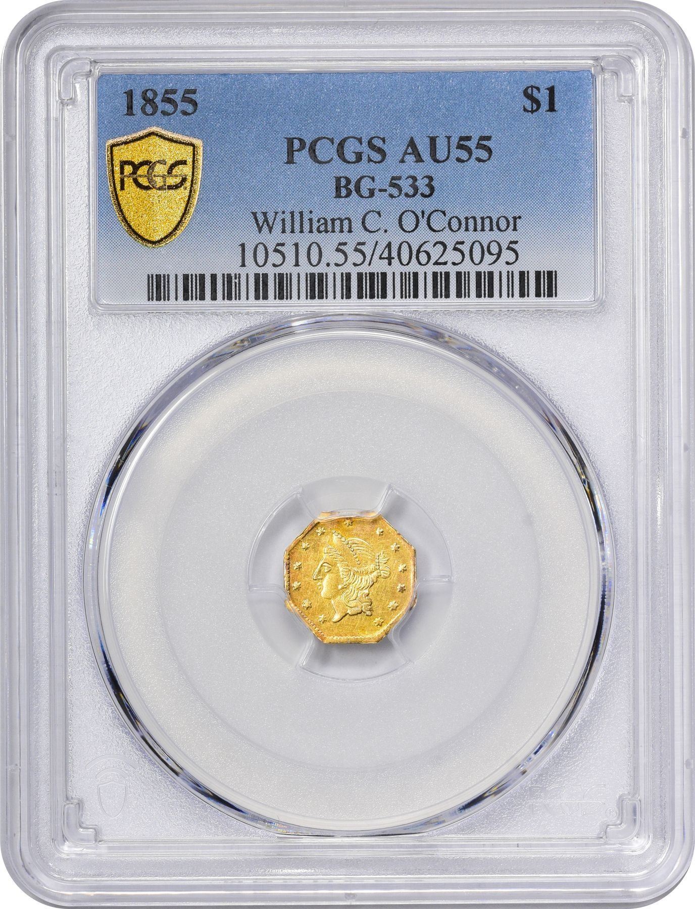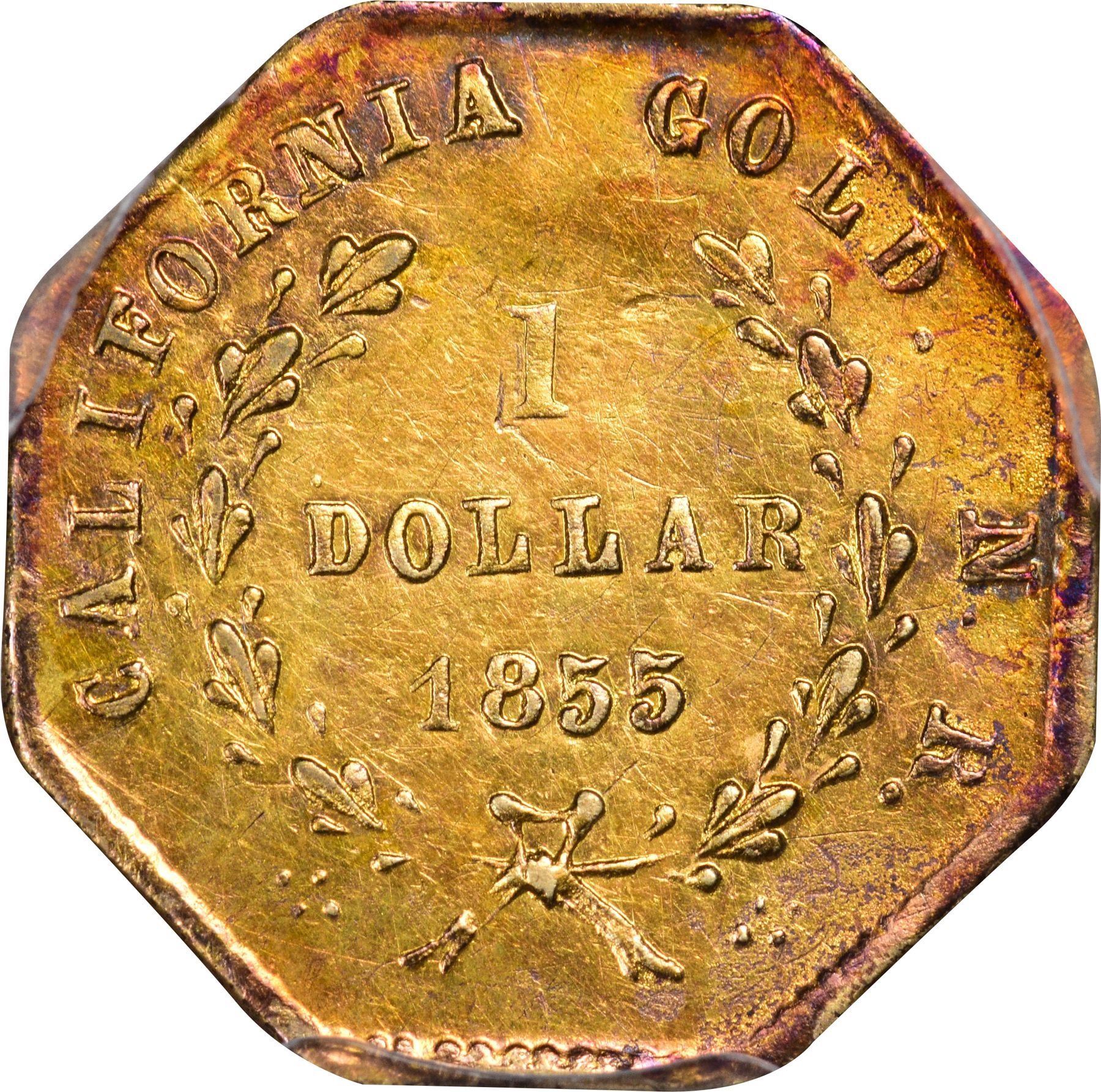 Description: 1855 N. R. octagonal 1 Dollar, BG-533, Die State II, final state (repeatedly repolished obverse, both lips separated from face, front edge of coronet receding; reverse also reground, with wreath fragmented and rust spots in field). PCGS AU55. Same obverse, repolished; similar reverse but date now 1855, N. R. follows GOLD. The only signed issue of Nouizillet & Routhier. Bright gold color with coppery toning at top of reverse, mirror surfaces slightly impaired by handling. PCGS AU55 William C. O’Connor (PCGS# 10510).