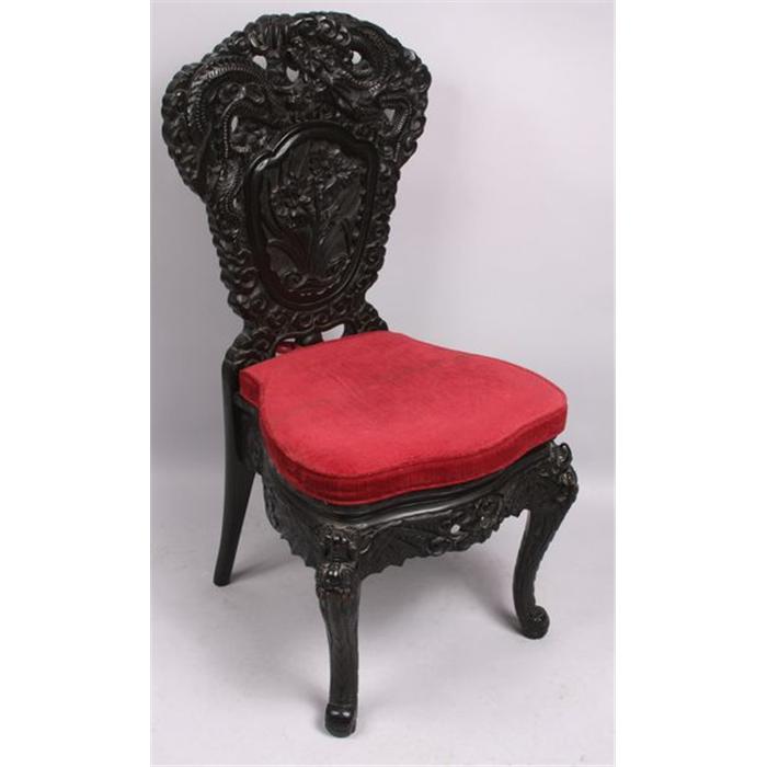 Heavily carved Chinese side chair, 42" h. x 20" w. x 19" d. Good condition.