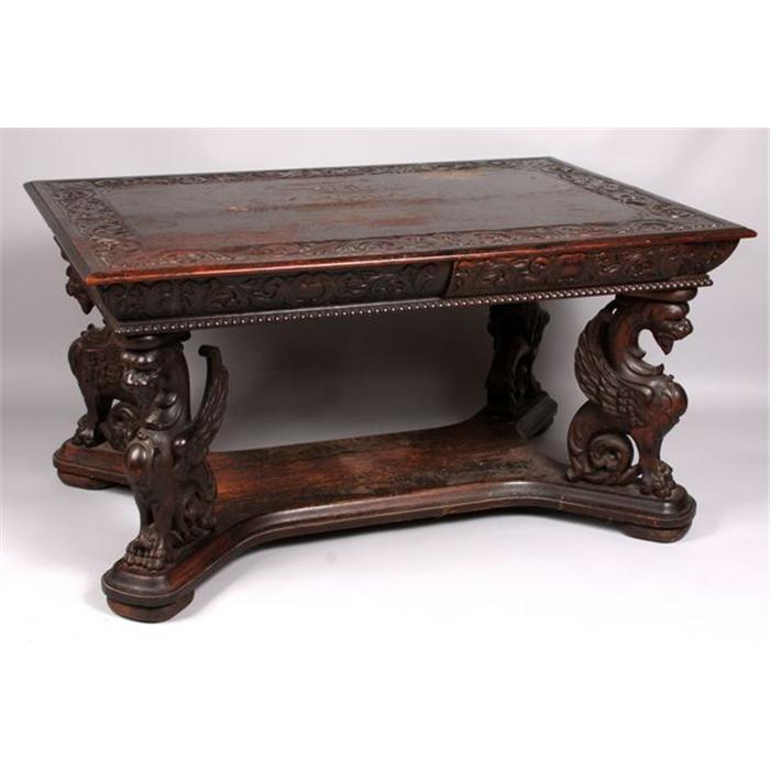 Heavily carved Chinese table with dragon motif legs, 29" h. x 55" w. x 37 1/2" d. Some finish wear to top.