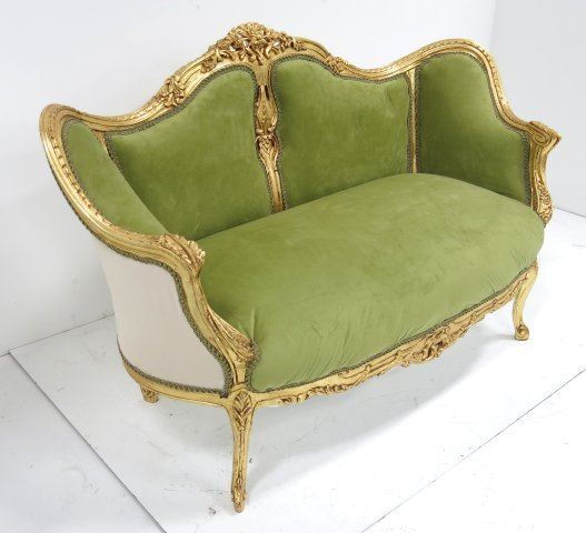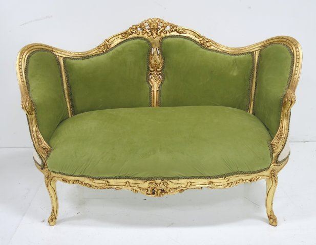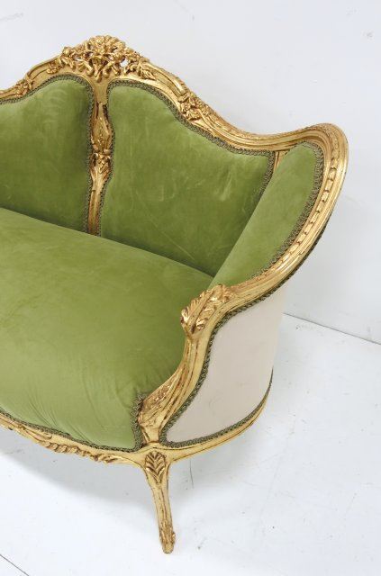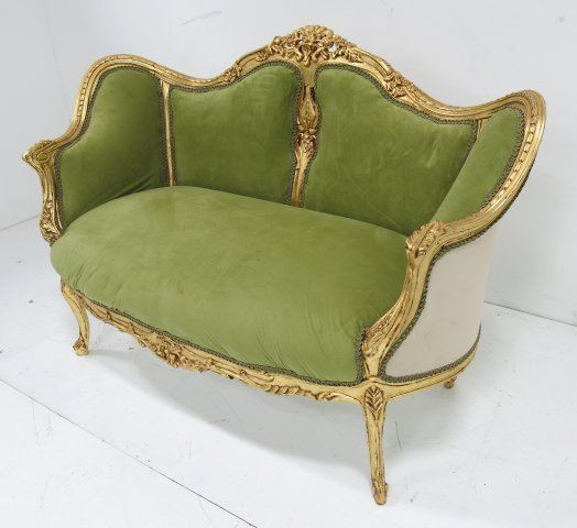Green velvet fabric on interior and gold leaf, ca. 20th c. Approx. 60" W x 25" D x 39" H. Good condition.