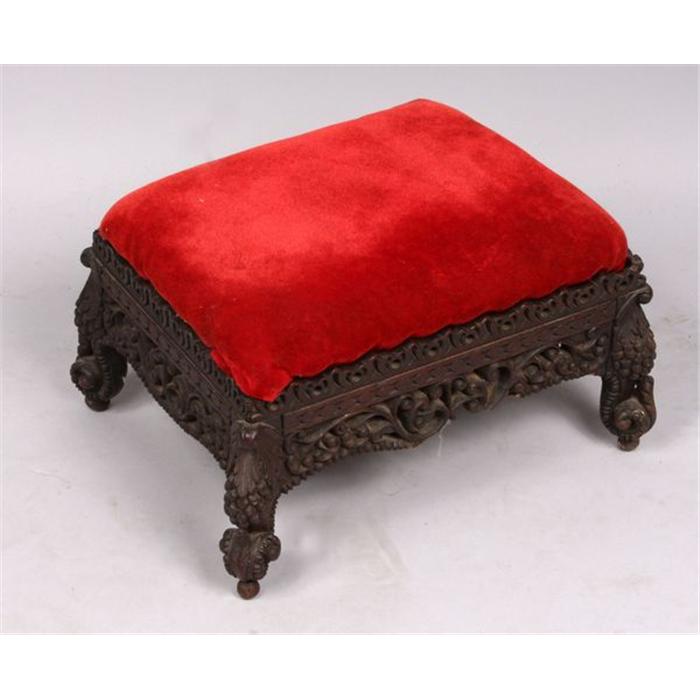 Heavily carved and upholstered Chinese or Anglo-Indian foot stool, 8 1/2" h. x 16" w. x 12" d. Good condition.