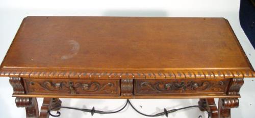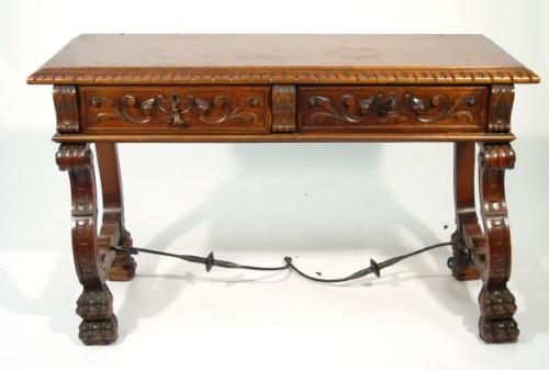 Heavily carved walnut hall table fitted two short drawers on scrolled supports with carved claw feet