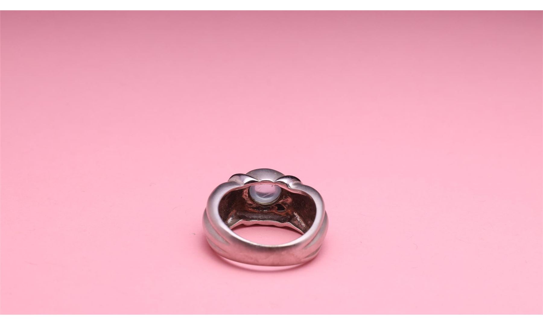 Heavy 18K White Gold & Blue Aqua Marine Cabochon Ring containing one aqua marine weighing approximately 0.70 cts. Total weight of ring is 11.2 gm. Estimated retail value $3,500.