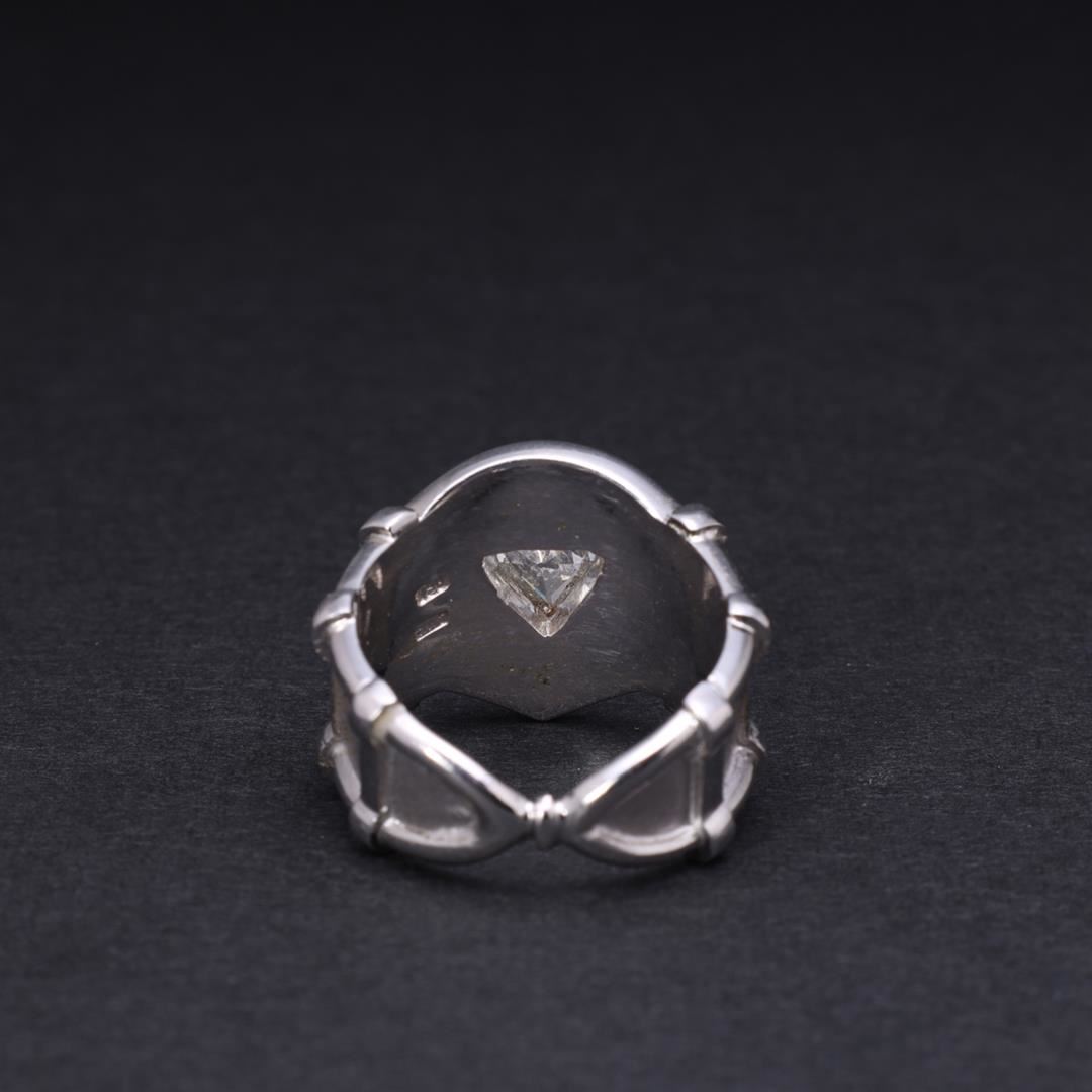 Heavy 18k white gold ring set with trillion cut diamond, marked 750 to interior; gross weight 13.2 g, size 7 1/4