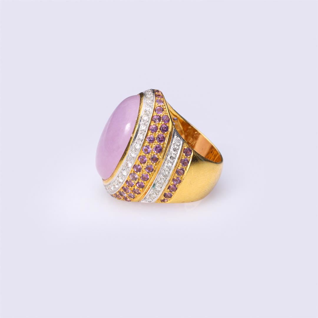 A heavy 18k yellow gold, diamond, amethyst and lavender jadeite cabochon ring, marked 18k, by designer Victor Loo; the jadeite set within a border bezel of full cut diamonds with additional diamond plus amethyst rows to the shoulders; gross weight 17.9 g,