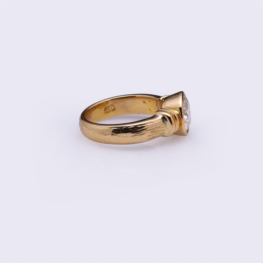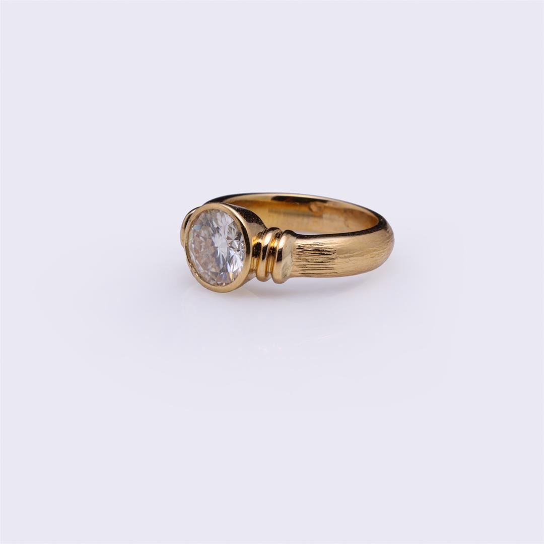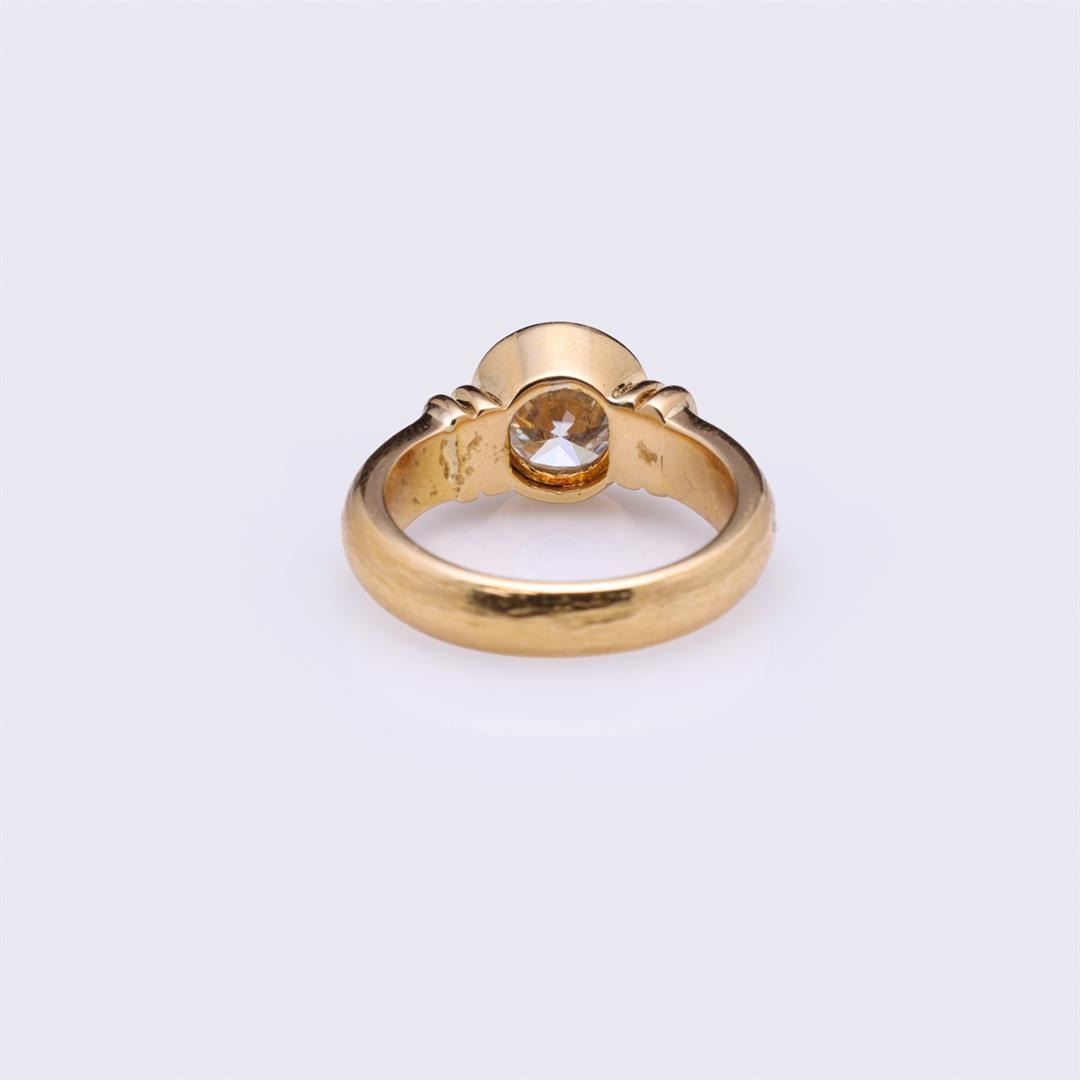Heavy 18k yellow gold ring; bezel set with large round cut moissanite, marked 750 to interior band; gross weight 9.7 g, size 6 3/4