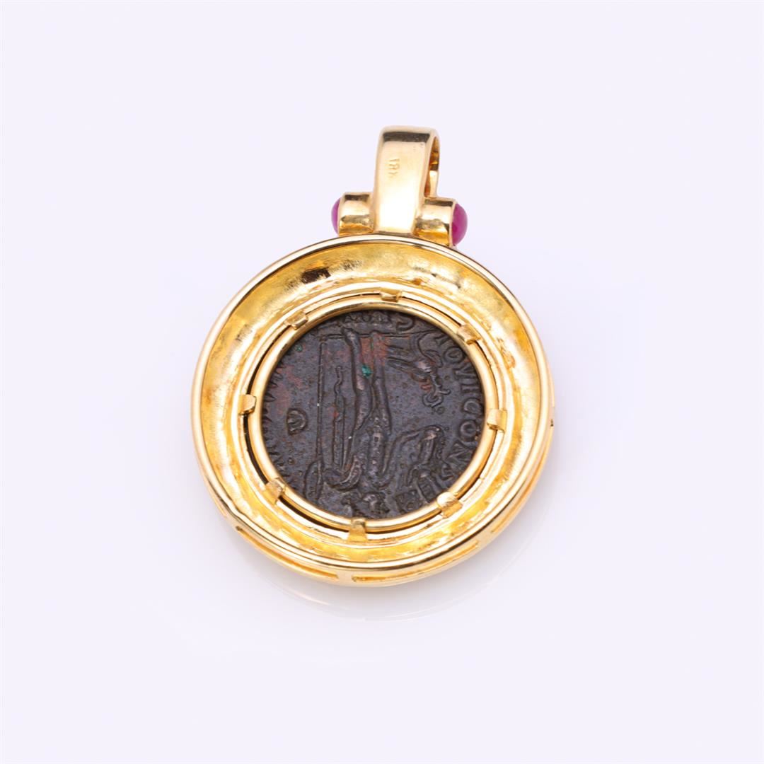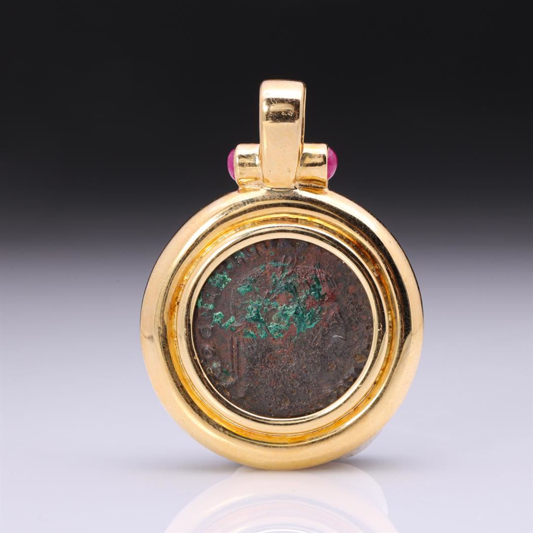 Heavy 18k yellow gold pendant with rubies and Imperial Roman copper coin, marked 18k, patina commensurate with age; gross weight 15.7 g, 1 5/8" x 1 1/8" (approx.)