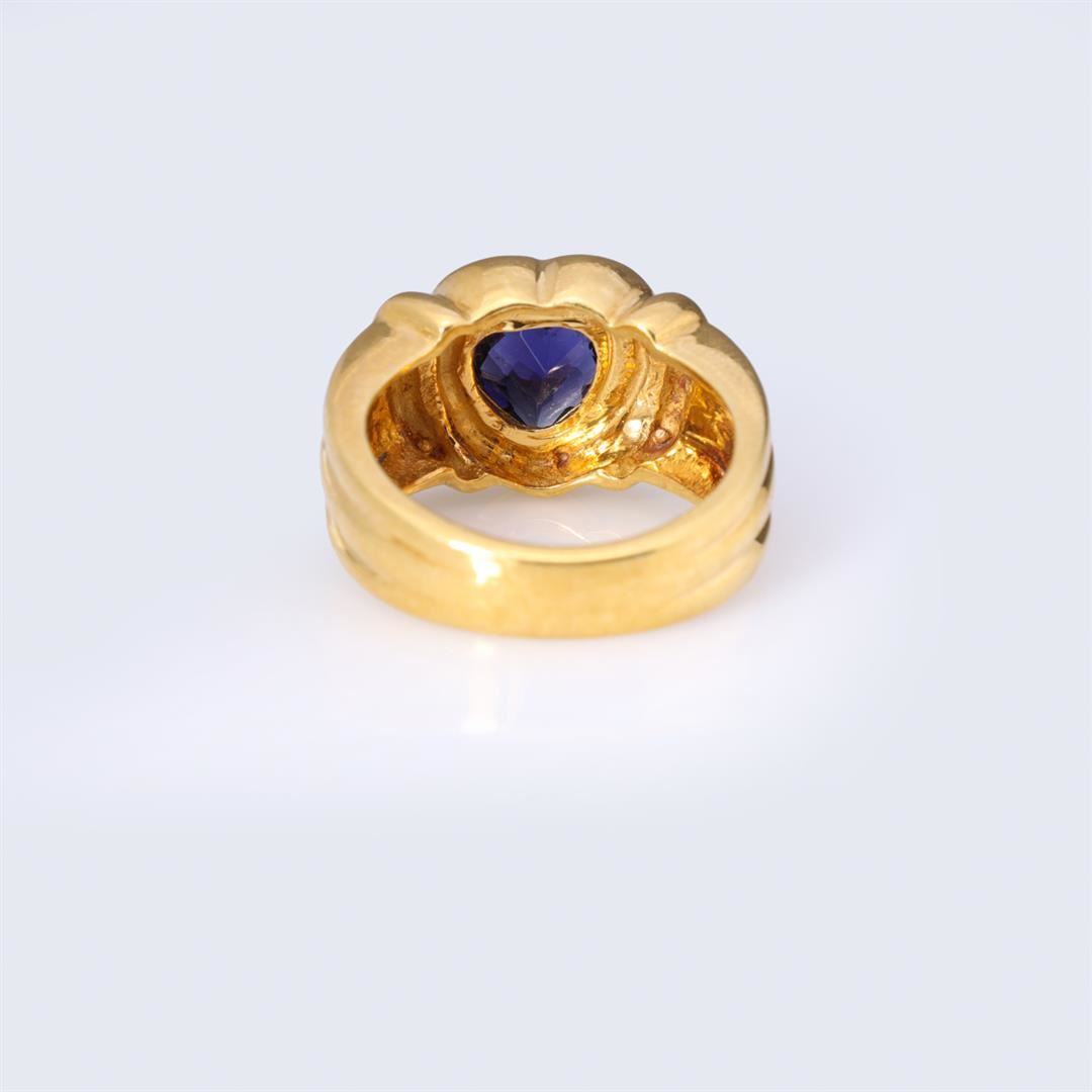 A heavy 18k yellow gold ring with graduated ribbed shank supporting a double layered heart shaped bezel set with heart shaped faceted blue sapphire in center, the interior of the ring marked WB 18K; gross weight 13.2 g, size 7