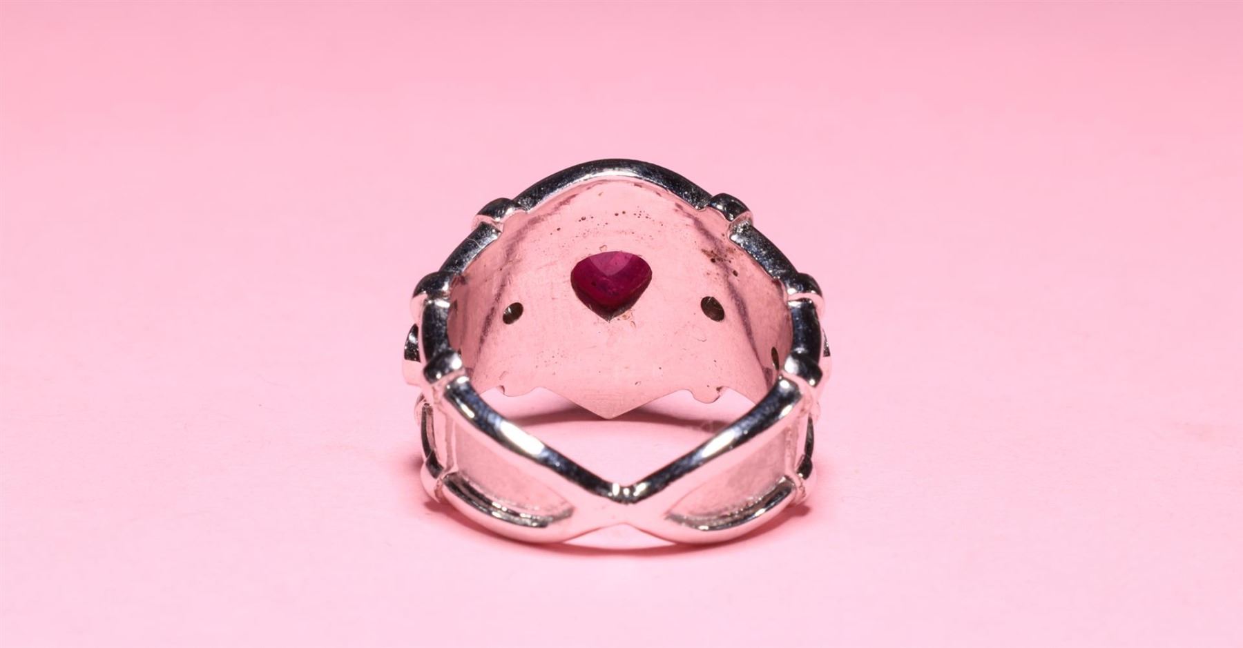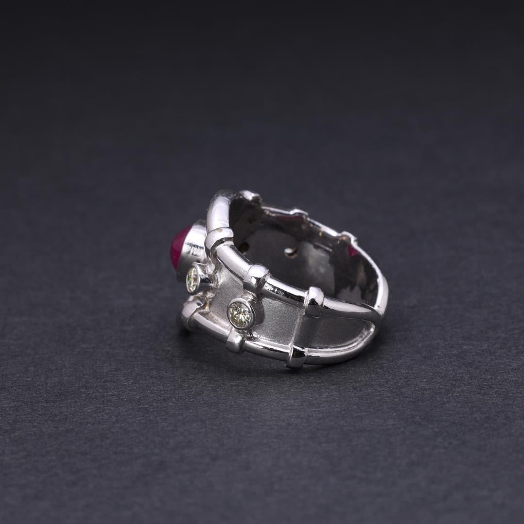 Heavy 18k white gold elaborate ring; teardrop ruby cabochon set in a wide recessed band with two round diamond accents to each shoulder 750 to interior; gross weight 14.1 g, size 7 3/4