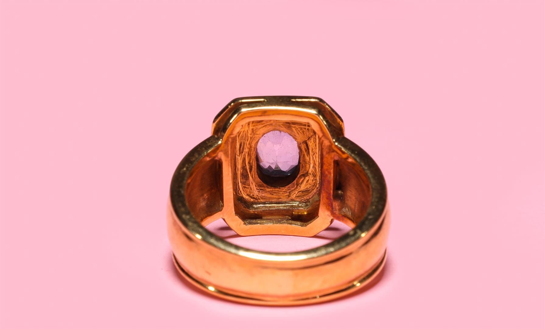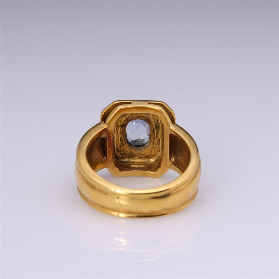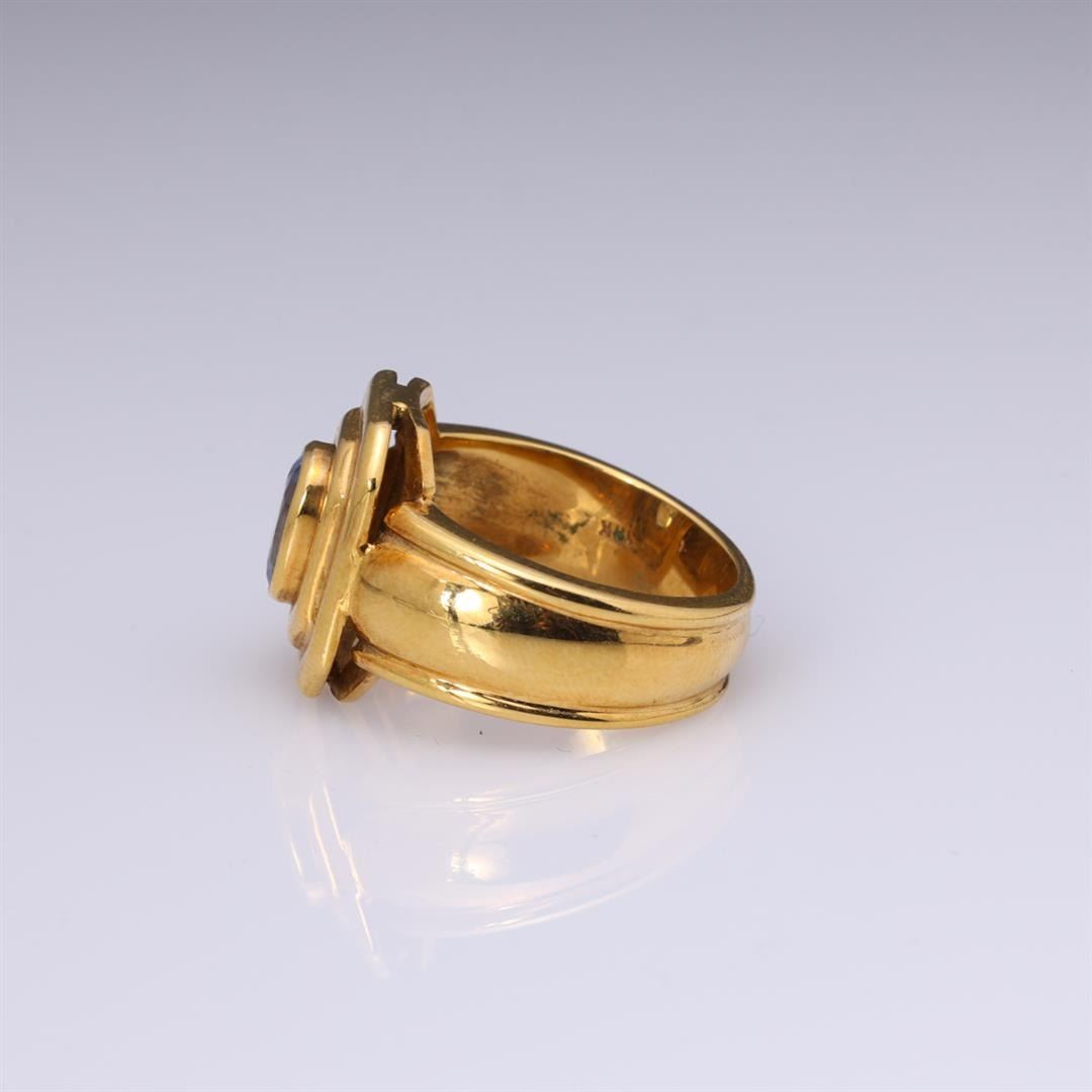Heavy 18k yellow gold ring; bezel set with possiblly Ceylon sapphire, marked 18k to interior band; overall good condition; gross weight 14.9 g, size 7 3/4