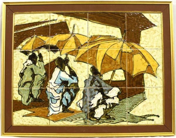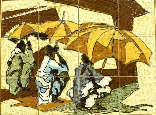 Heavy African Tourists on the Beach Framed Ceramic Tile Picture, visual measures 18'' x 24'', framed measurement of 21.25'' x 27'', weighs approximately 14lbs.