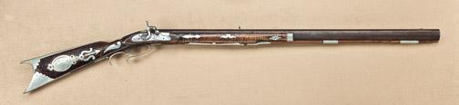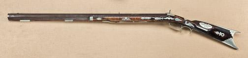 Heavy Barrel, half stock transition “Kentucky” to plains rifle marked F. Lehman, Lancaster PA on breech of barrel and lock with maker’s signature L. Biddle on top flat of barrel. The heavy barrel measures 34-1/4”, the rifle measures 49-3/4” overall. Heavy octagon barrel measures approx .38 caliber, rifled and measures 1-1/16” across the muzzle. The forend and barrel appear to be set back slightly or reduced. The stock shows a good natural striping with many engraved German Silver inlays and an oval shaped German Silver patchbox. The top of the comb is sheathed in German Silver and the rifle shows German Silver buttplate, toeplate, triggerguard, and mounts. With a fine engraved American eagle on inlay, which is just above the cheekpiece. The rifle shows at least 21 German Silver inlays in fish, scrolls, leaves, arrows, etc. The stock is good with a couple of compression cracks in the forend, some slight darkening, normal use, some slight scorching from getting too near the camp fire by the triggerguard, normal handling and carry. The rear sight has been changed to a more modern sight and needs to be corrected, however the dovetail is not enlarged and is an easy fix. The action is good,