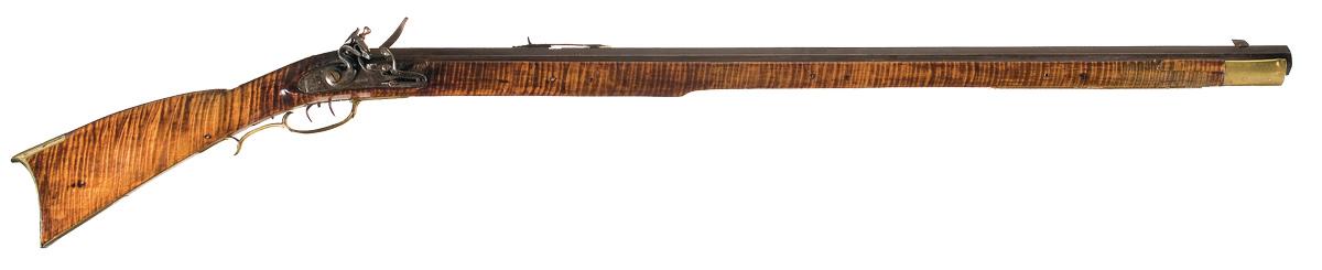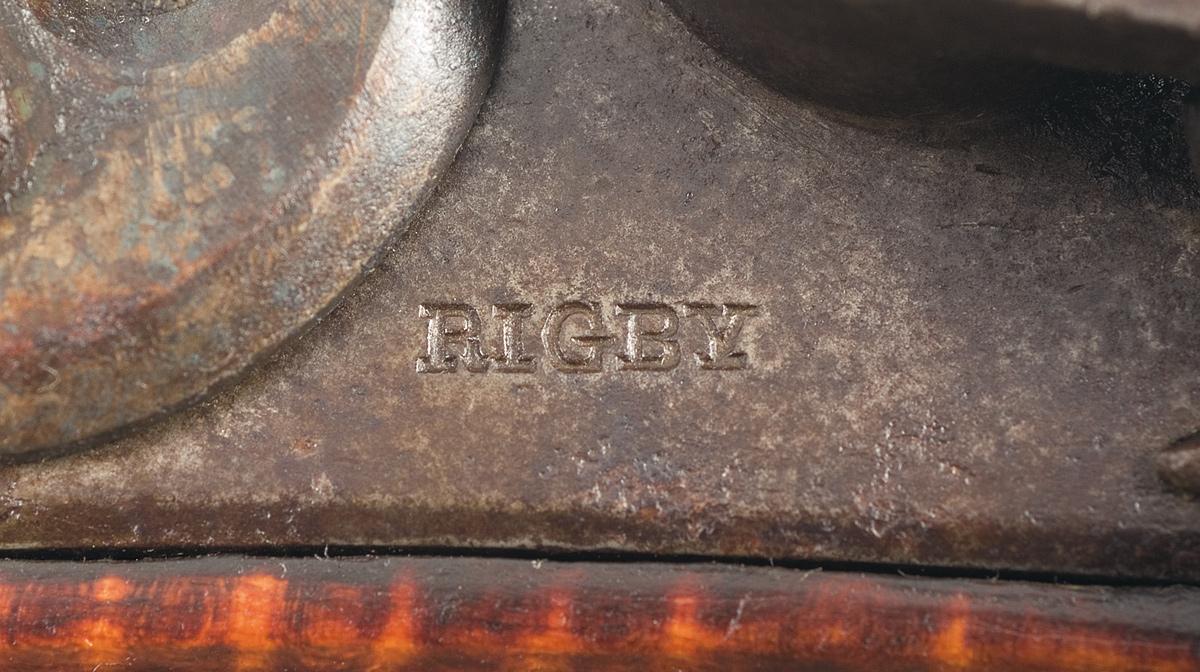 Patridge front and semi-buckhorn rear sights, with an extra dovetail slot covered by the rear sight and sleeved bore with .4" thick barrel walls. Reconverted to flintlock, with a high flashpan fence, "RIGBY" ahead of the hammer, double set triggers and a copper reverse plate. Full length tiger stripe stock, with a long brass tip, brass plate reinforced flat underside to the forearm, brass trigger guard with handrest, raised cheekpiece and a brass buttplate.