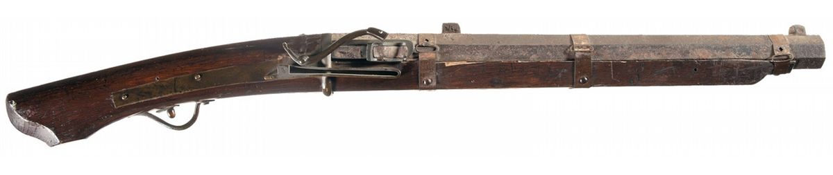 Condition: Fair, with a rough brown patina on the barrel, some rust and spotting, and a dark aged color to the brass components. Splinters are absent from the upper edges of the forearm, with replacement bands, cracks and dings. Mechanically fair.