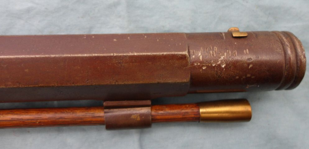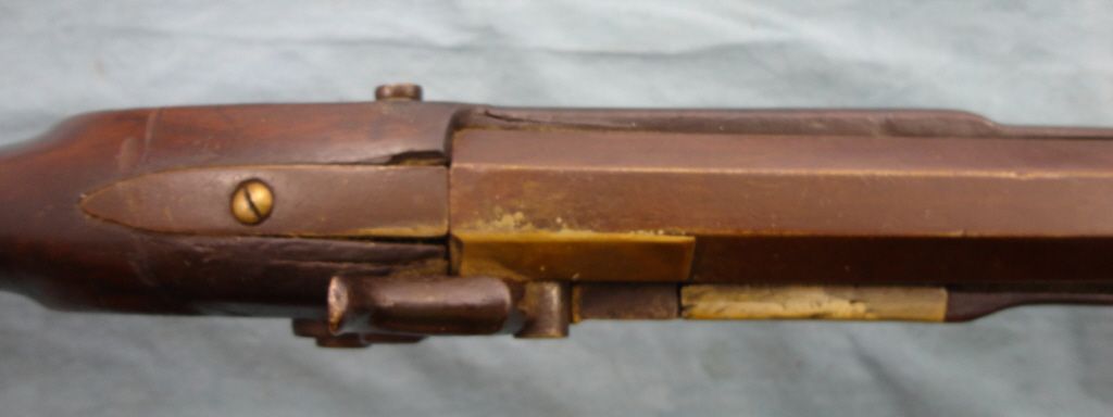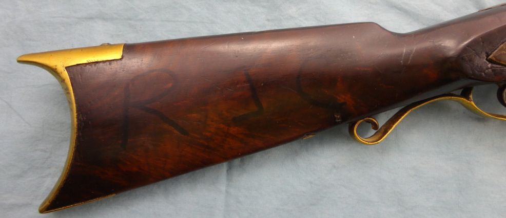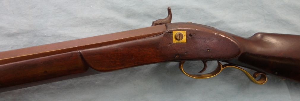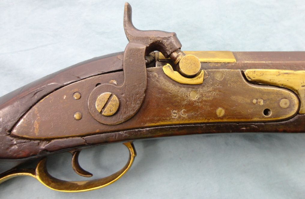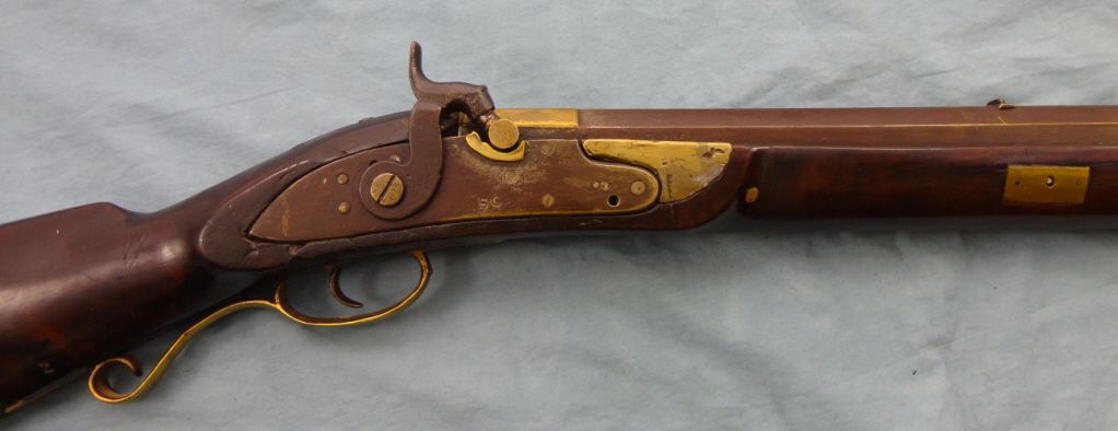 #NSN. Antique. Percussion approx. 54 cal. Has heavy 32" bbl. Side plate appears to be steel & brass plated marked SC. Gun looks to be originally a flintlock converted to percussion. Mechanism appears to function fine. Heavy walnut stock in good condition w/some cracks from age, but appears to be solid. Brass & pewter furniture. Butt stock is marked w/black magic marker "RJC".