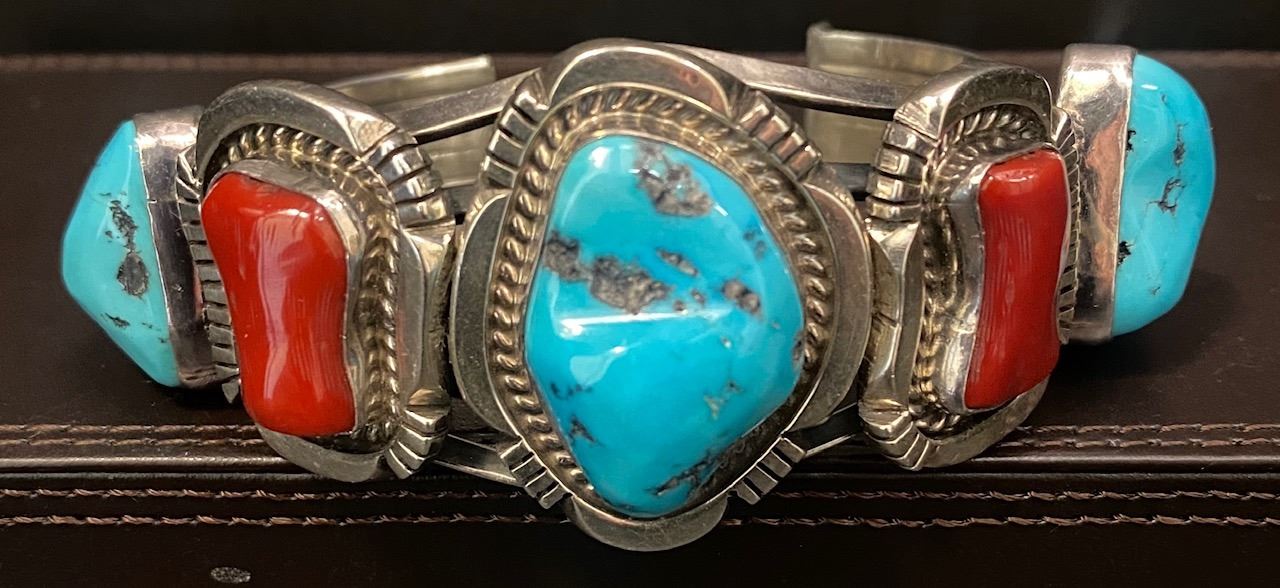 A heavy 95-gram Bracelet or Cuff using 3-Sleeping Beauty Stones and 2-Coral Stones. It measures 1 3/8-inches high, 6-inches Inside measurement with a 1 1/8-inch opening.