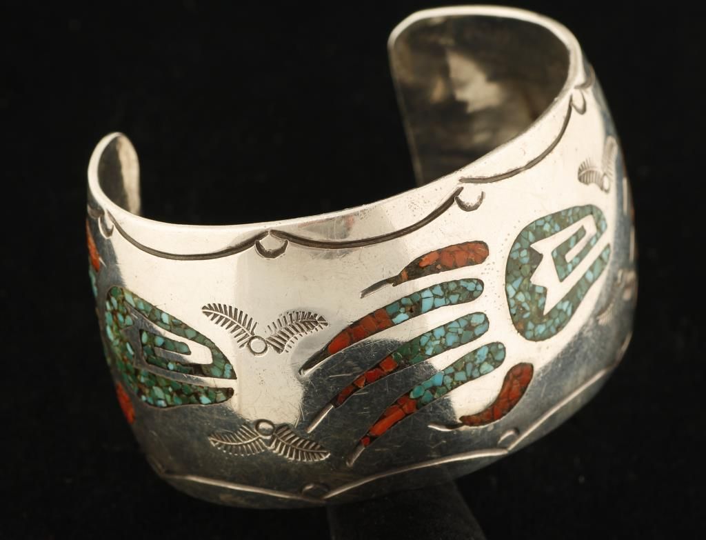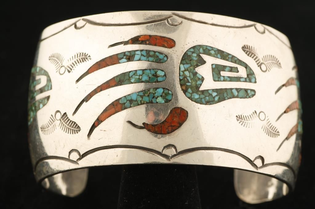 Singer. Very heavy and handsome chip inlay cuff by noted Navajo artist Charlie Singer. Charlie is brother to renowned artist Tommy Singer an learned his chip inlay skills from him. Charlie has been making jewelry since the 1970's. Shown here is a chip inlay in the form of a bear paw print using turquoise and coral chips. Due to its age, there is some minor loss of the chip inlay on one end of the cuff. The cuff is very heavy and weighs 63 grams.