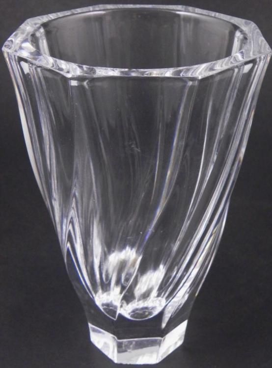 This Heavy Crystal Vase has an octagonal top, with the flat side portions curved into a subtle twist design. It is 5 inches in diameter, and 8 inches high. The condition is excellent. * * This fine quality vase is traditional with an artistic twist.