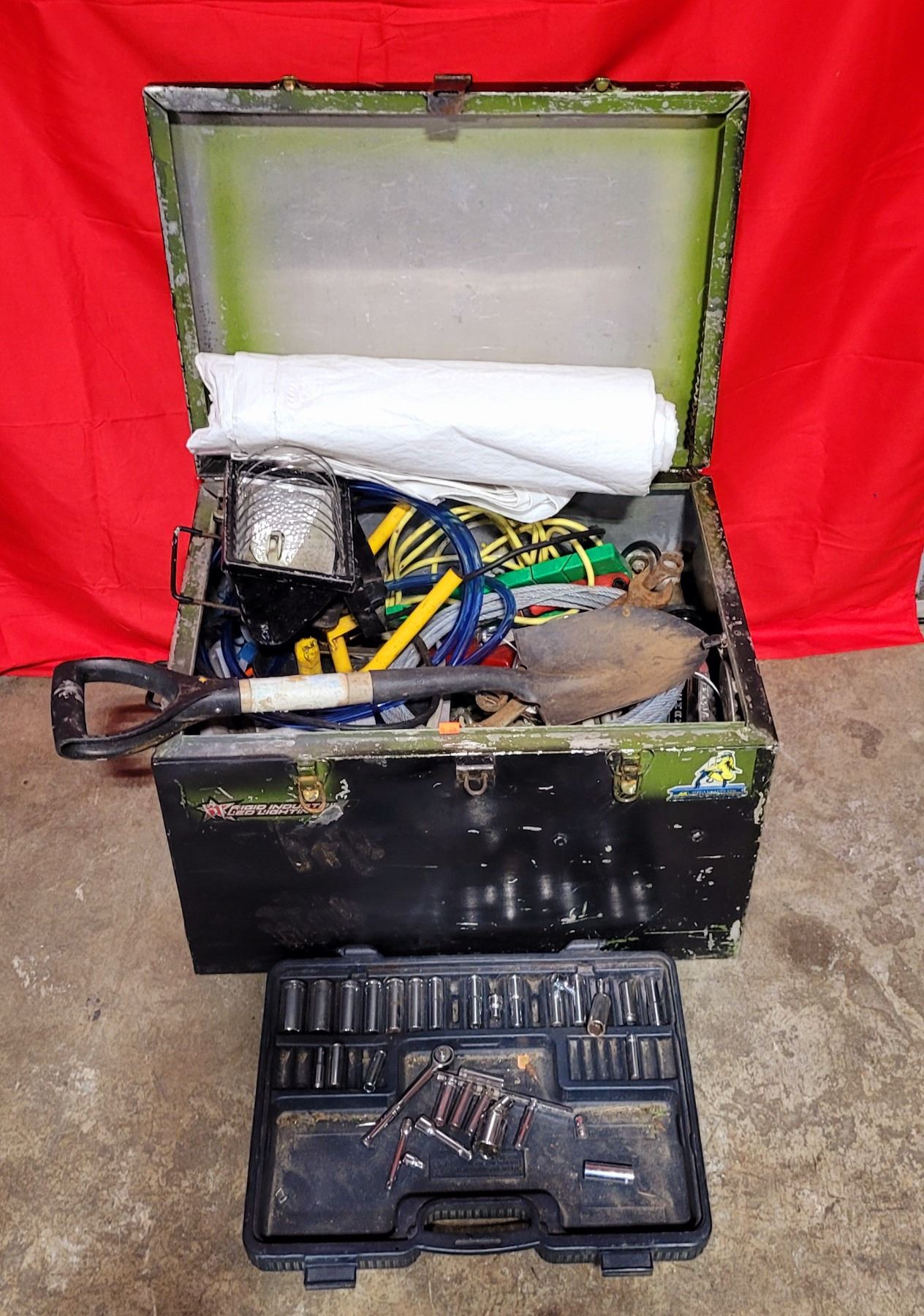 Heavy Metal Container Of Misc. Tools, Cords & Hardware Including Socket Set