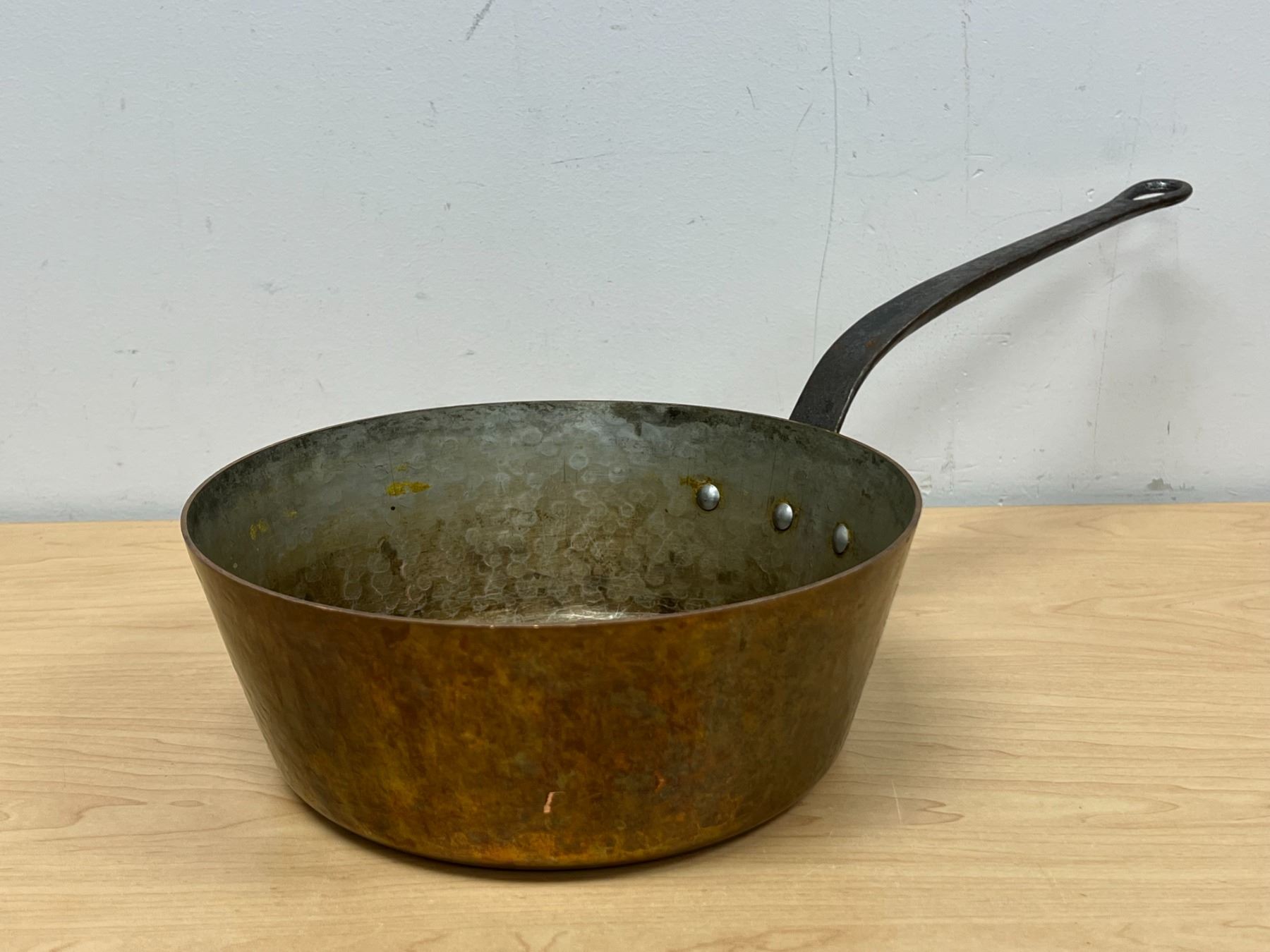 Heavy Metal (Possibly Copper) Long Handled Pot Approx: 9.75"W 3.75"T & 10" handle