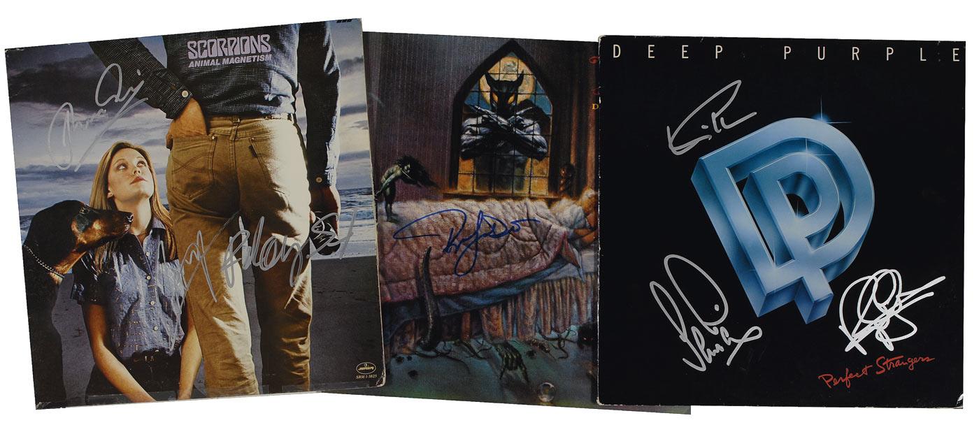 Three signed albums, each signed in ink or felt tip by their respective musician(s). Signers are: Ronnie James Dio (Dream Evil), Klaus Meine, Rudolf Schenker, and Matthias Jabs (Animal Magnetism), and Ian Gillian, Roger Glover, and Ian Paice (Perfect Strangers). In very good to fine overall condition.