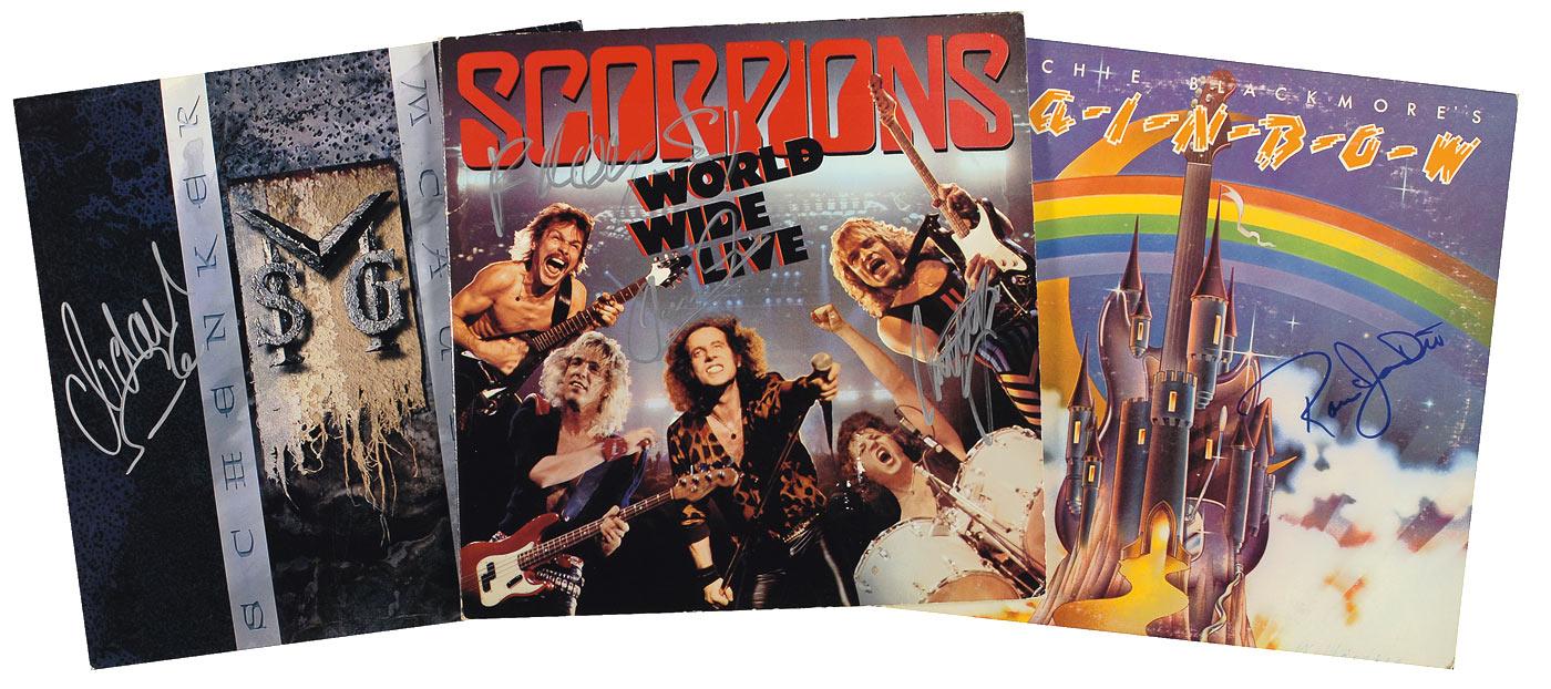 Three items: Two albums, Ritchie Blackmore’s Rainbow signed in blue felt tip by Ronnie James Dio and World Wide Live signed in silver ink by three members of the Scorpions; and an MSG album flat signed in silver ink by Michael Schenker. In overall very good to fine condition. The albums are included.