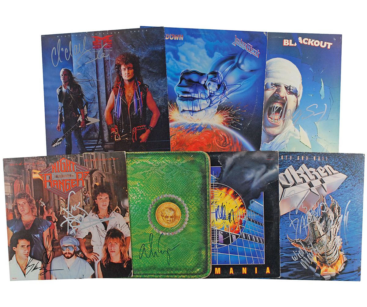 Collection of seven items, six albums and one flat, each signed in ink or felt tip by the respective musician(s). Albums are signed by: Rob Halford (Ram It Down); Rudolf Schenker (Blackout); Phil Collen, Rick Savage, and Rick Allen (Pyromania); Alice Cooper and Dennis Dunaway (Billion Dollar Babies); Don Dokken, George Lynch, Mick Brown, and Jeff Pilson (Tooth and Nail); and Jack Blades, Kelly Keagy, and Alan Gerald (Midnight Madness). The album flat is for the McAuley Schenker Group’s Perfect Timing, and is signed in silver ink by Michael Schenker. In overall very good to fine condition. All of the albums, with the exception of Night Ranger, are included.