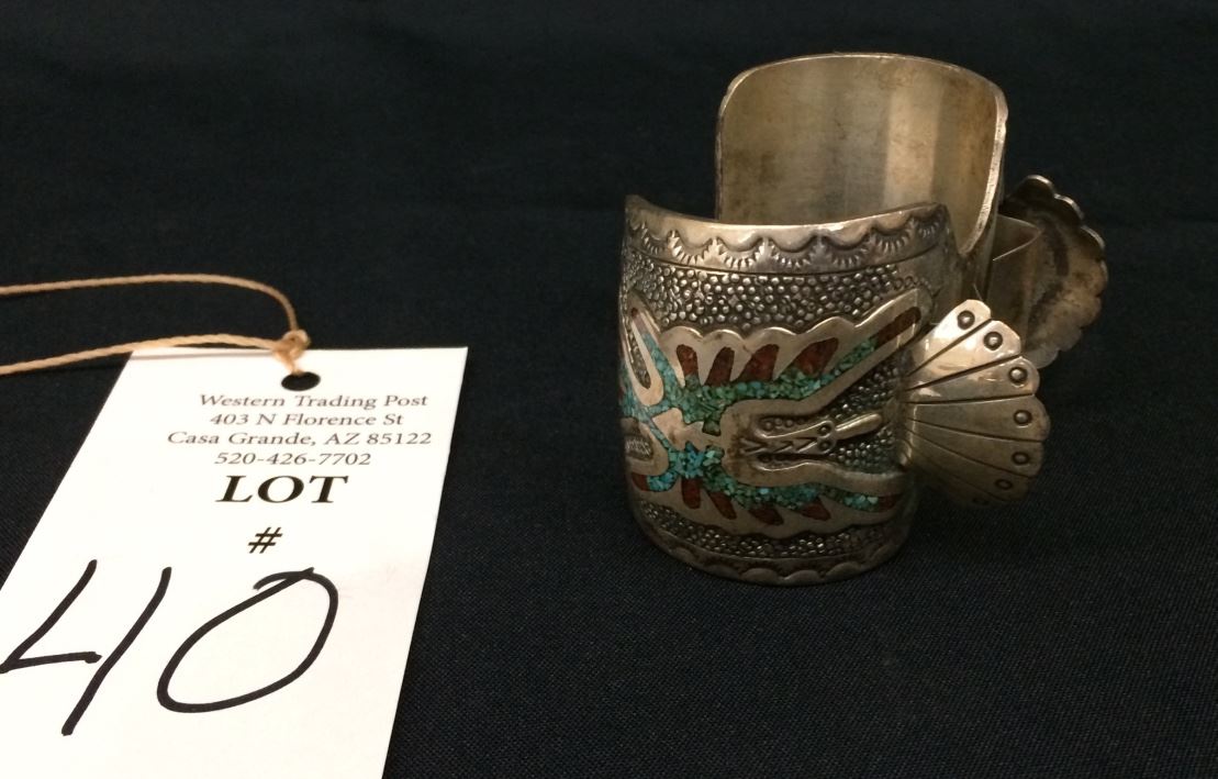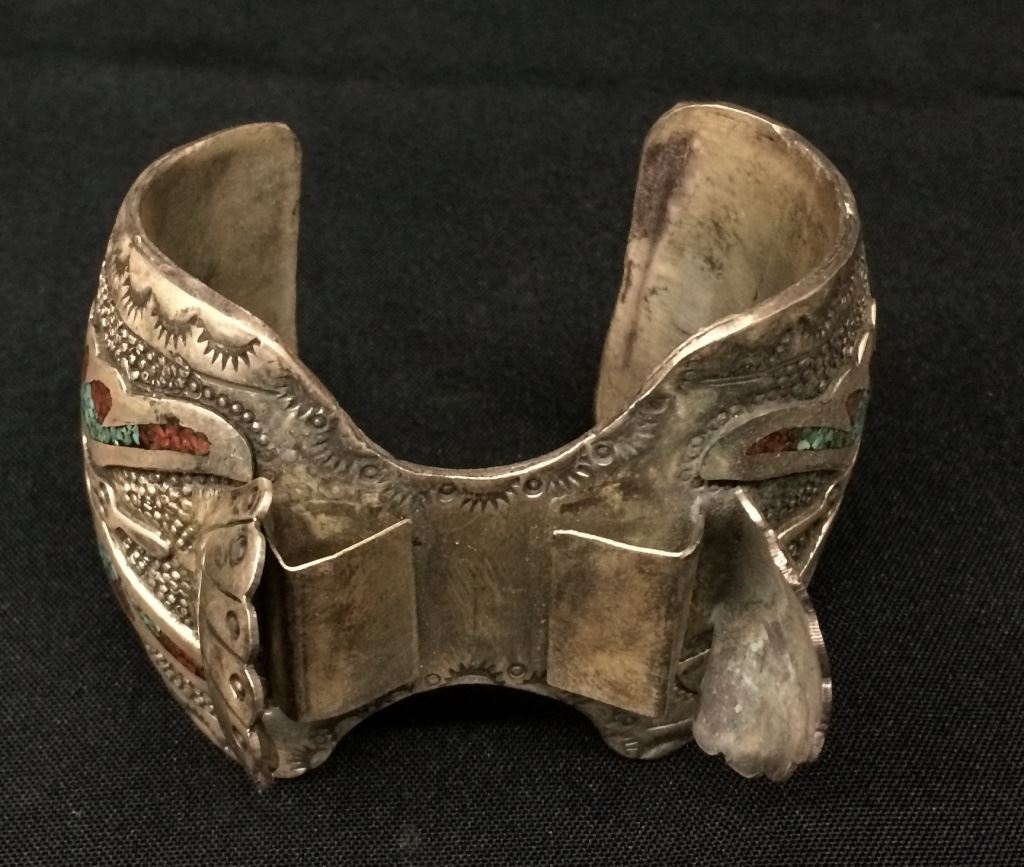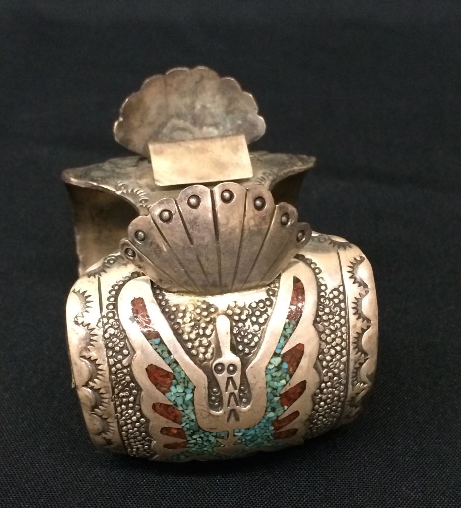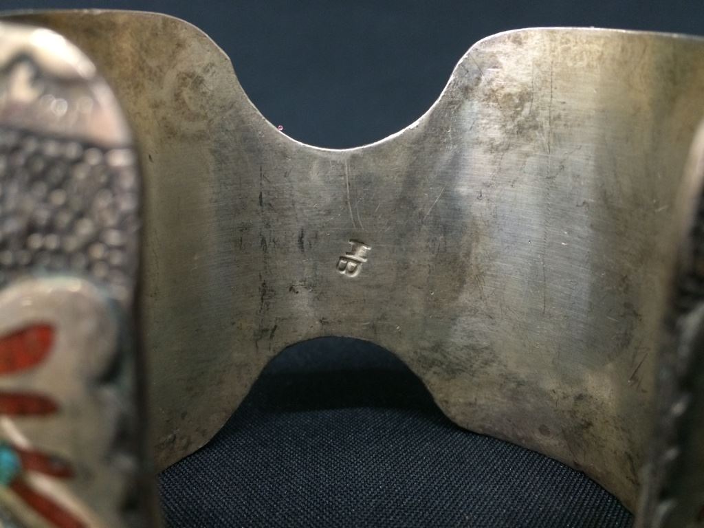 This heavy, vintage Navajo watch cuff came from an old trading post and is basically “New Old Stock,” never having a watch in it before. It is hallmarked HB and was tested as sterling. It measures 5.5” inside plus there is a 1.25” opening. It is 2.25” wide and weighs 132g. Shipping: There will be a $5 handling / packaging fee for shipping this lot. The actual cost of postage will be added on top of that.