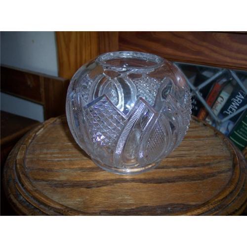 Very pretty and heavy rose bowl.Not sure what the pattern is.Very good condition.The only thing I can find wrong is I can feel a tiny sharp area on one of the points on the design.Not sure if it is a chip or just rough.Otherwise perfect.Measures 4 1/2" tall and 17 1/2" around the center.