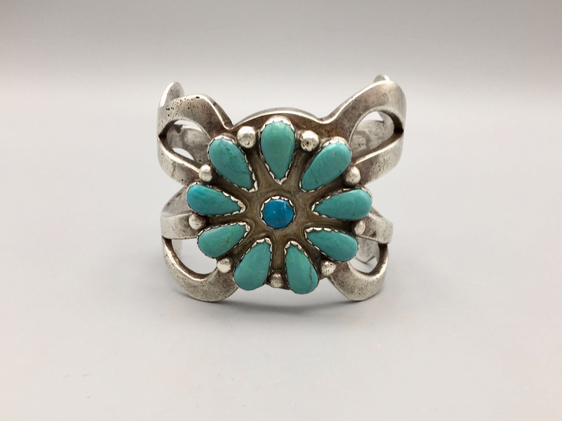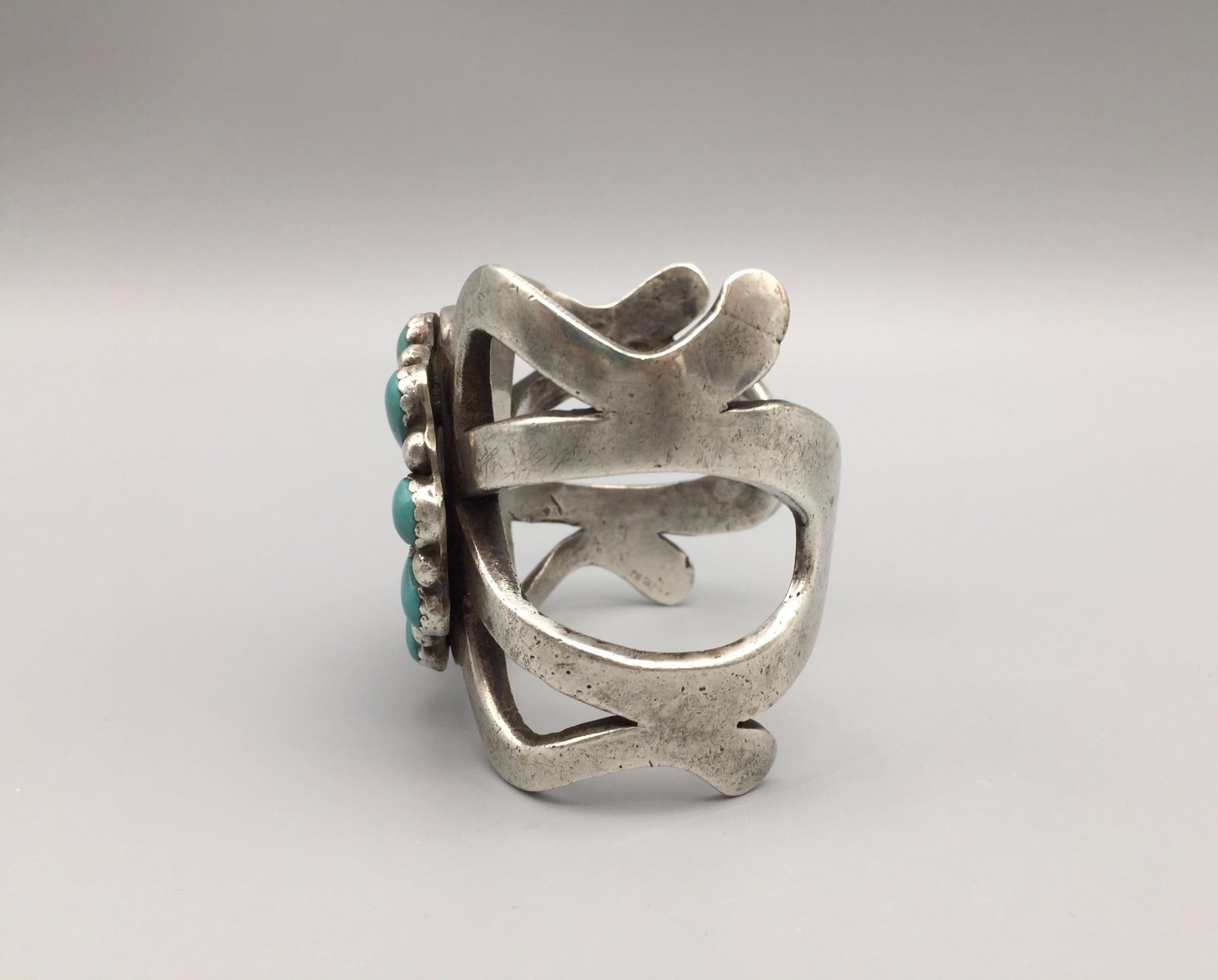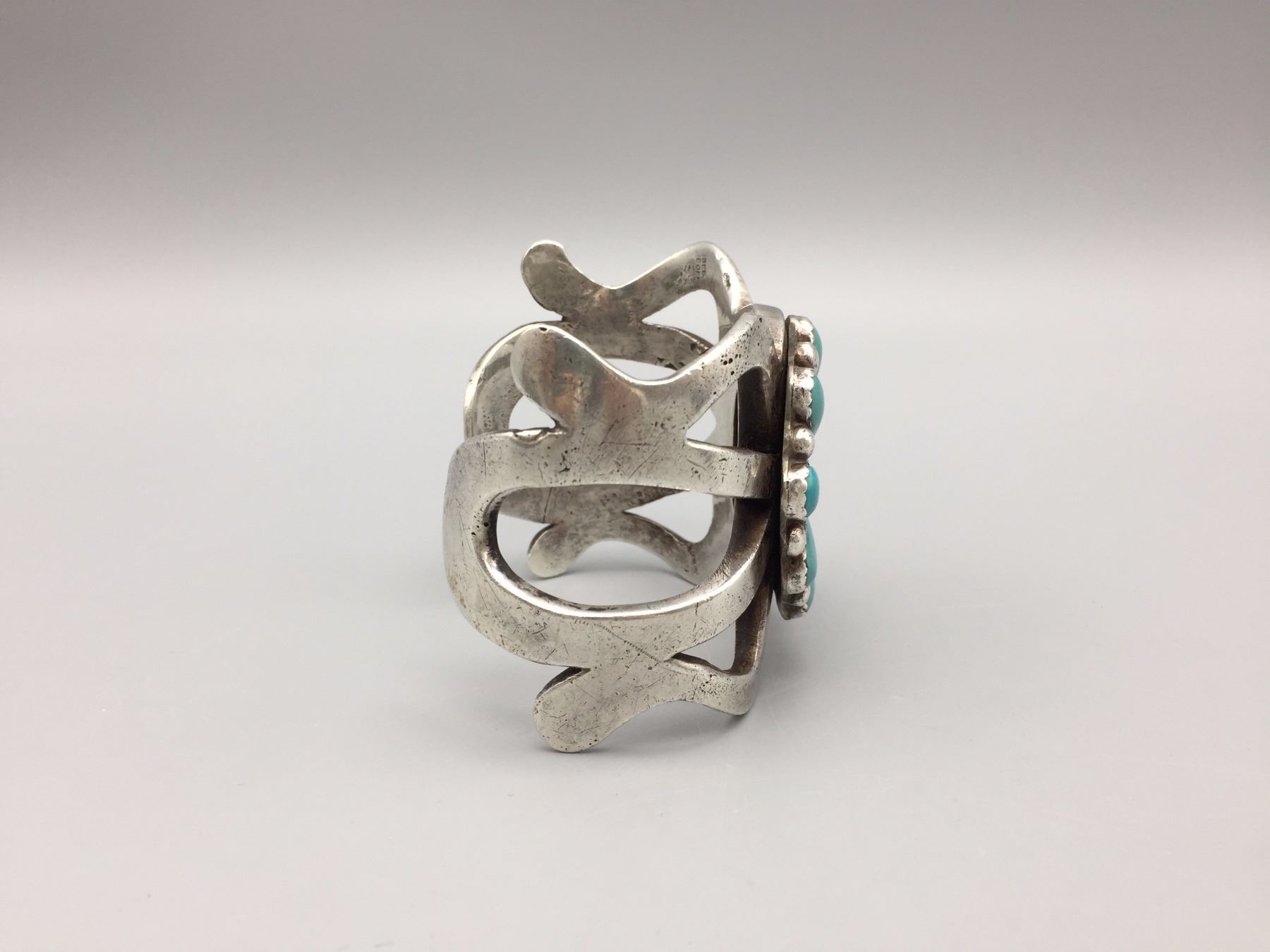 Description: Large, heavy sand cast bracelet featuring a cluster of beautiful turquoise. Maker: Unknown, has a hard-to-read hallmark. Approx. Age: Circa 1980s. Size: Inside circumference measures approx. 6" with a 1 1/8” gap (making this bracelet fit about a 7 1/8” wrist). It is 2 1/2” wide across the face and weighs 205 g. Condition: Good for its age, normal wear expected. Please look closely at the pictures - they are an important part of our description. Shipping: There will be a $5 handling / packaging fee for shipping this lot. The actual cost of postage will be added on top of that.